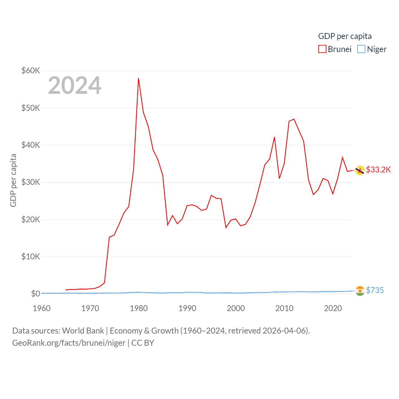 By GDP, Brunei ranks 142/197 ($15.3B) and Niger ranks 130/197 ($19.9B). By GDP per capita, Brunei ranks 36/197 ($33,153), while Niger ranks 187/197 ($735).