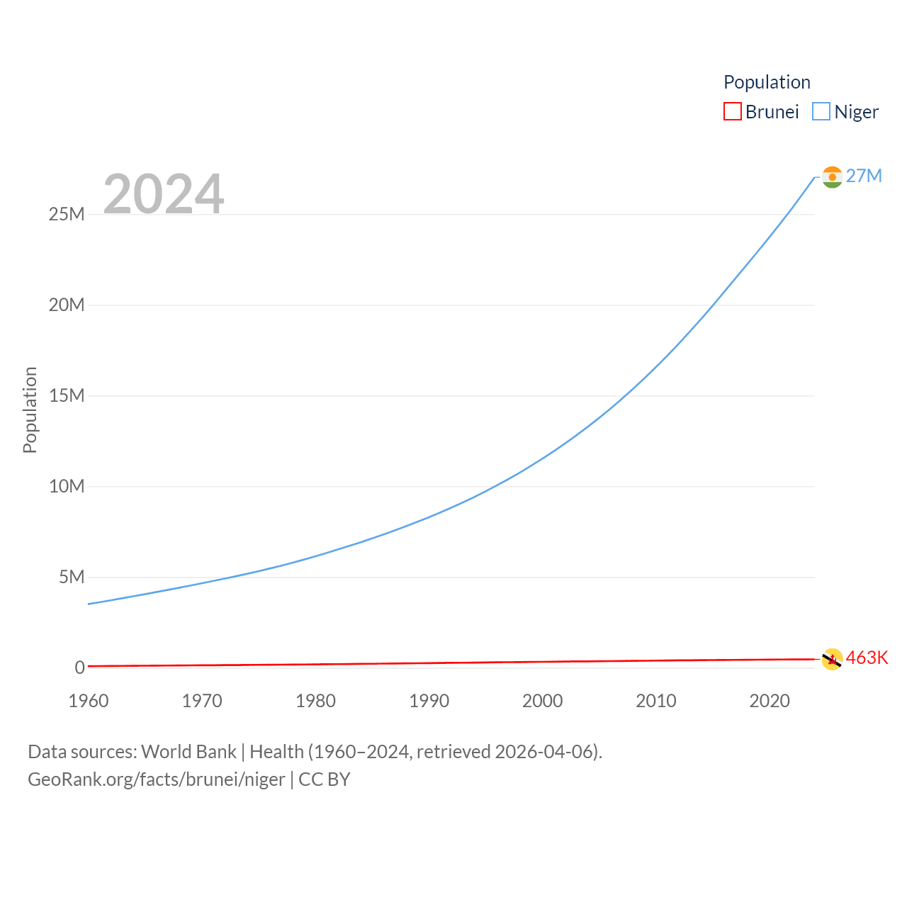 Brunei has a population of 463K (ranked 170/197), compared with 27M in Niger (ranked 55/197). Brunei's land area is 2,035 sq mi versus 489,076 sq mi for Niger (ranked 165th vs. 20th).