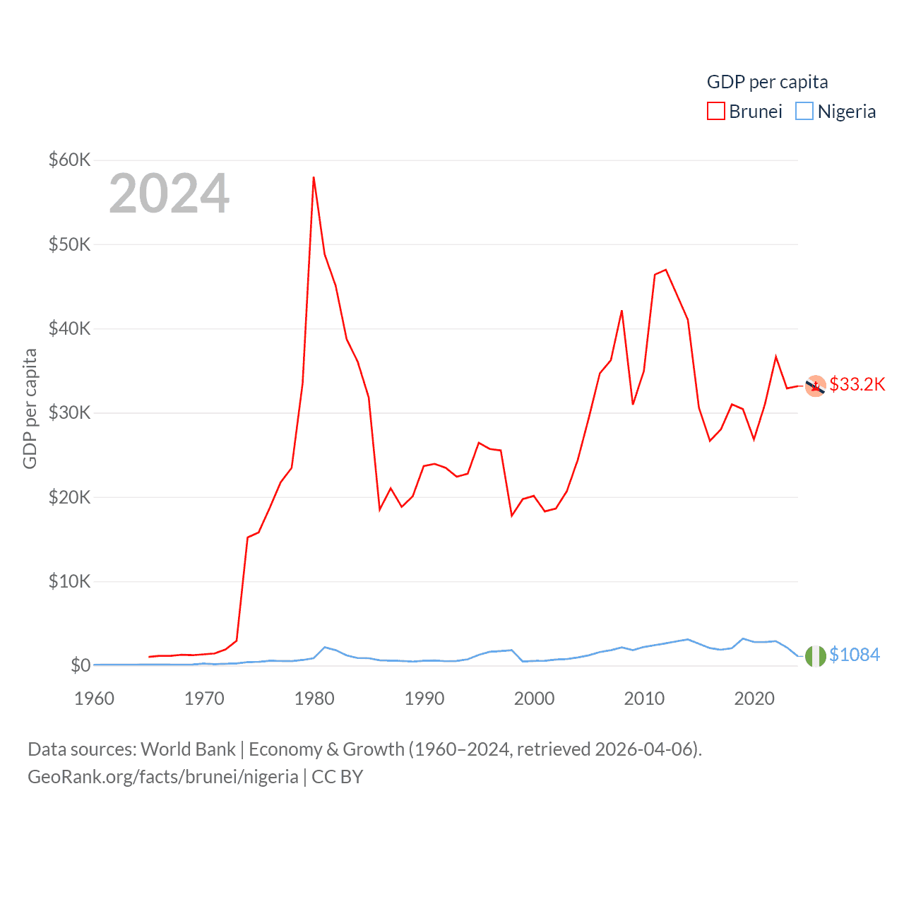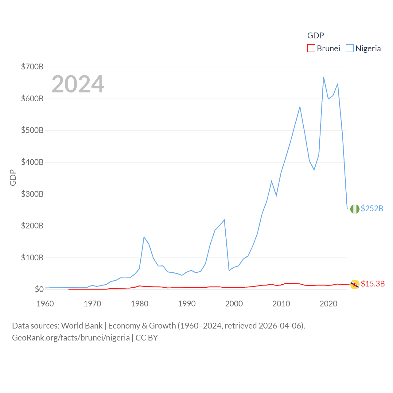 By GDP, Brunei ranks 142/197 ($15.3B) and Nigeria ranks 54/197 ($252B). By GDP per capita, Brunei ranks 36/197 ($33,153), while Nigeria ranks 174/197 ($1,084).