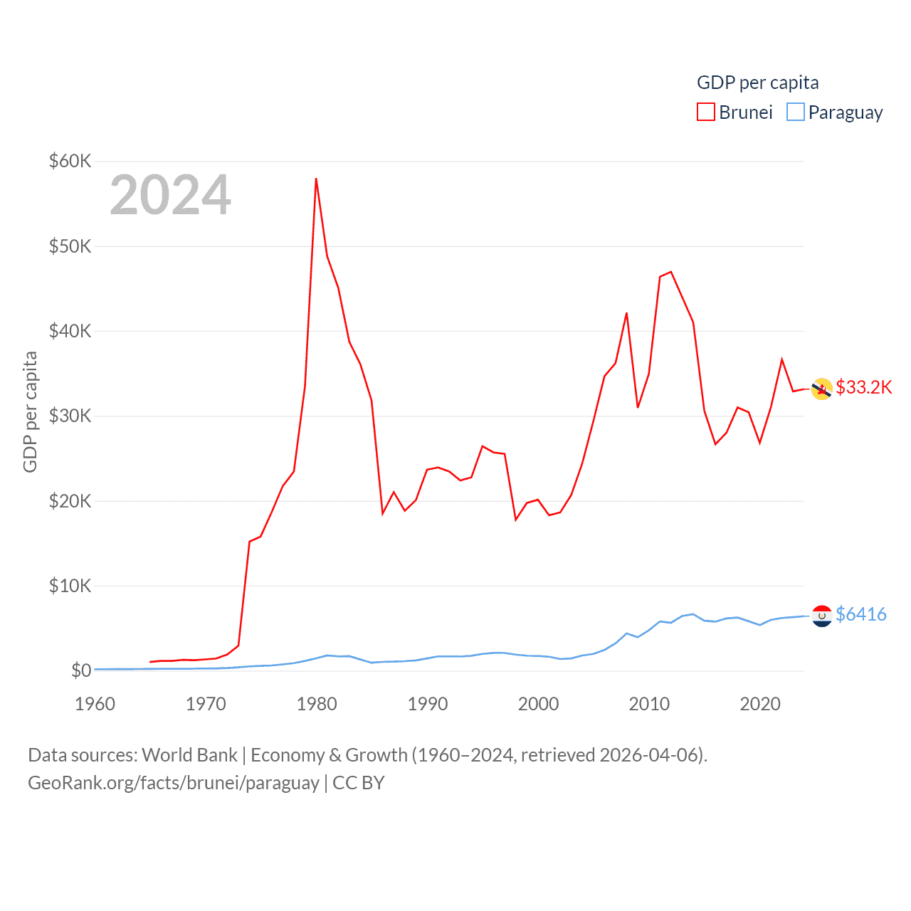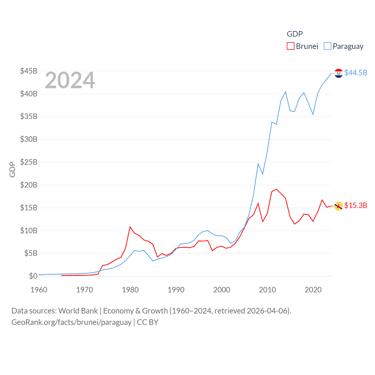 By GDP, Brunei ranks 142/197 ($15.3B) and Paraguay ranks 98/197 ($44.5B). By GDP per capita, Brunei ranks 36/197 ($33,153), while Paraguay ranks 109/197 ($6,416).