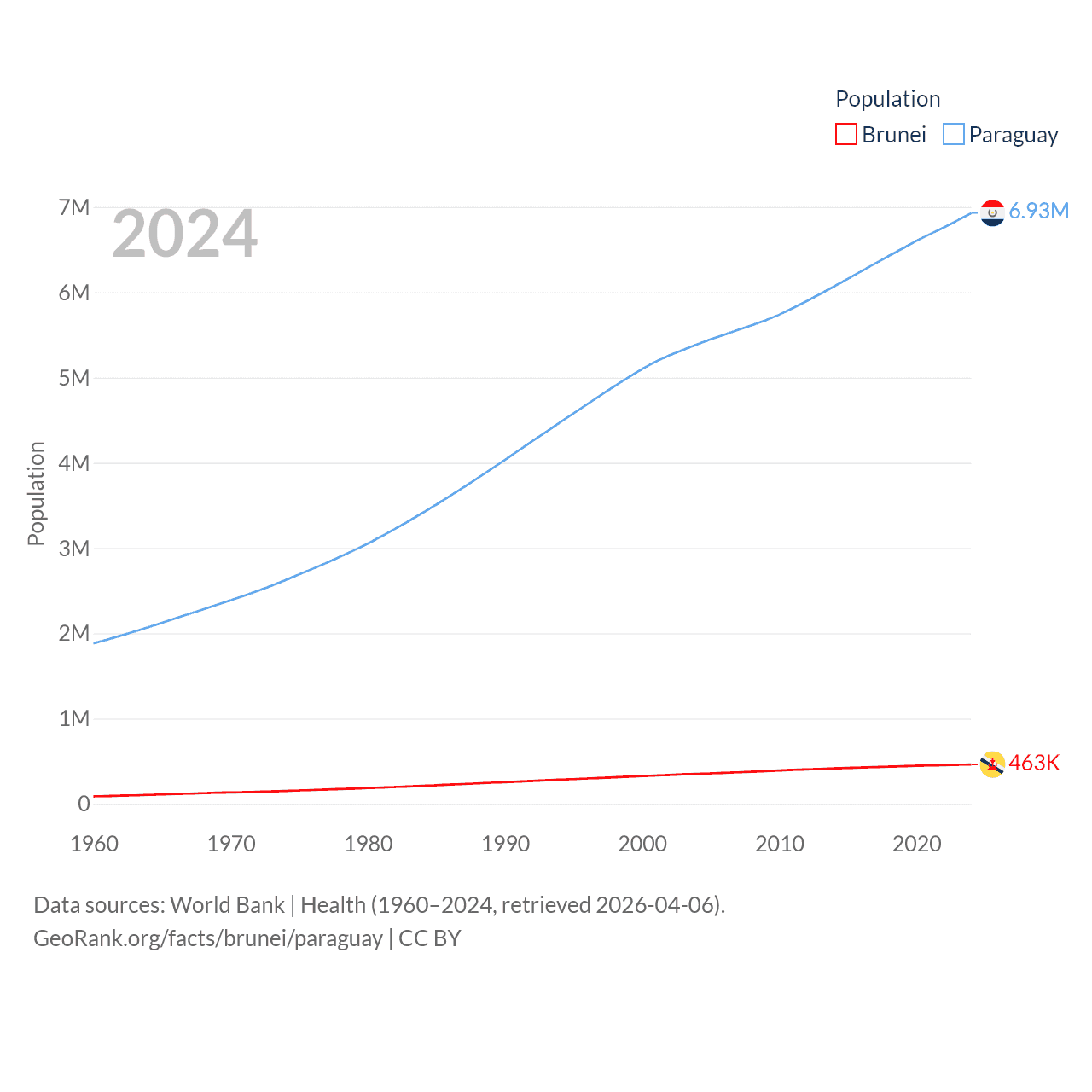 Brunei has a population of 463K (ranked 170/197), compared with 6.93M in Paraguay (ranked 107/197). Brunei's land area is 2,035 sq mi versus 152,901 sq mi for Paraguay (ranked 165th vs. 59th).