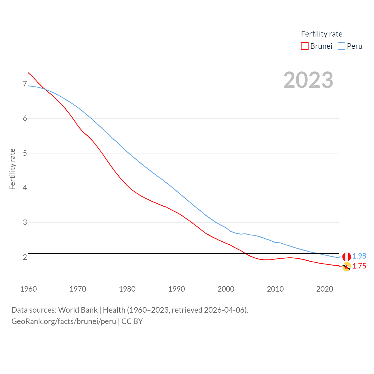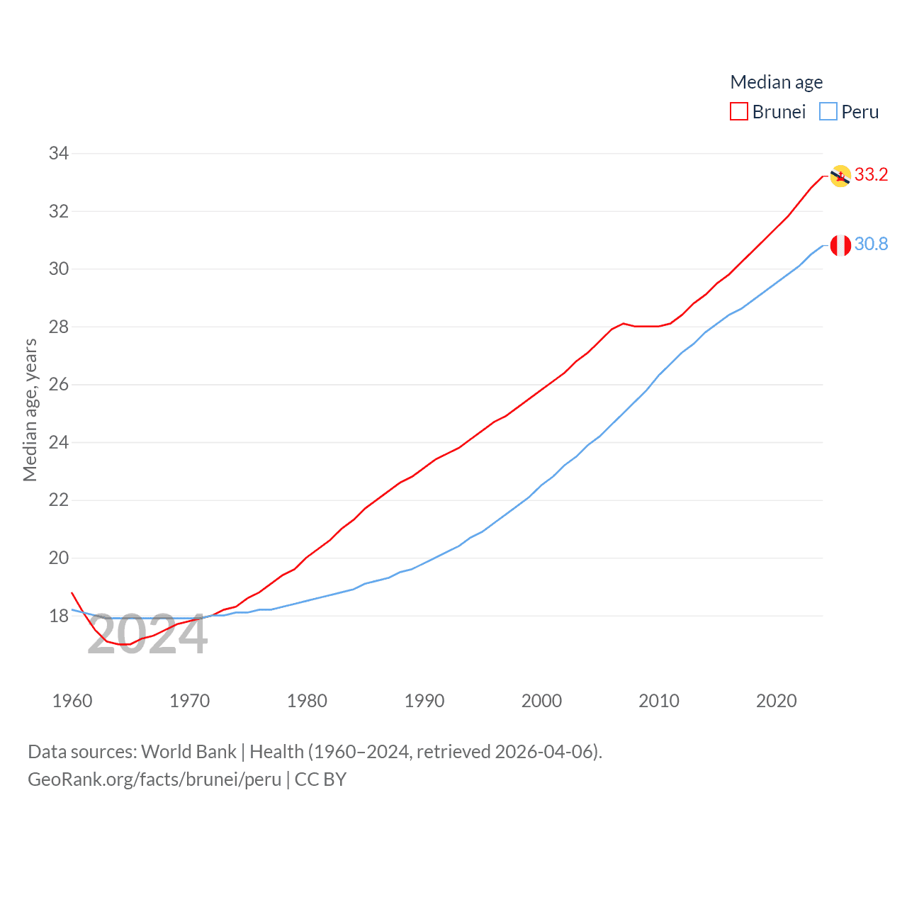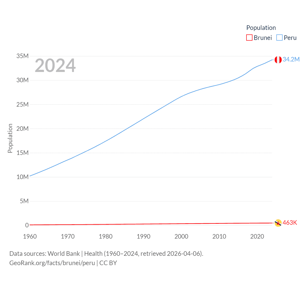 Brunei has a population of 463K (ranked 170/197), compared with 34.2M in Peru (ranked 48/197). Brunei's land area is 2,035 sq mi versus 494,211 sq mi for Peru (ranked 165th vs. 19th).