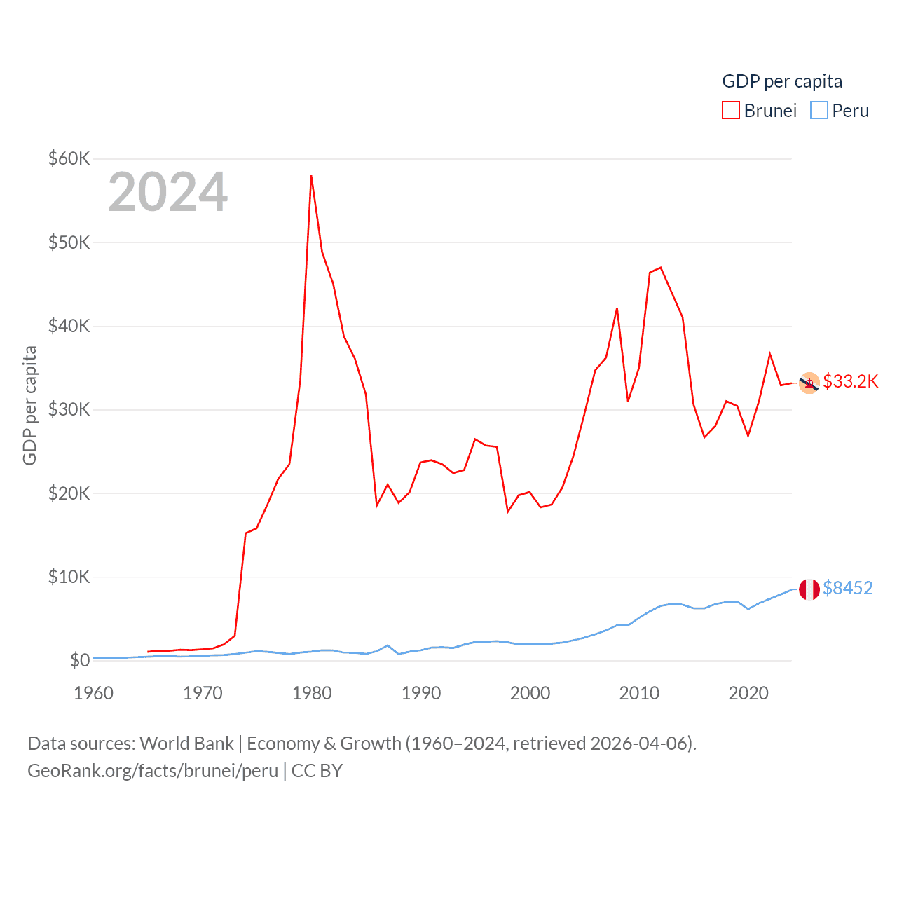 By GDP, Brunei ranks 142/197 ($15.3B) and Peru ranks 49/197 ($289B). By GDP per capita, Brunei ranks 36/197 ($33,153), while Peru ranks 91/197 ($8,452).