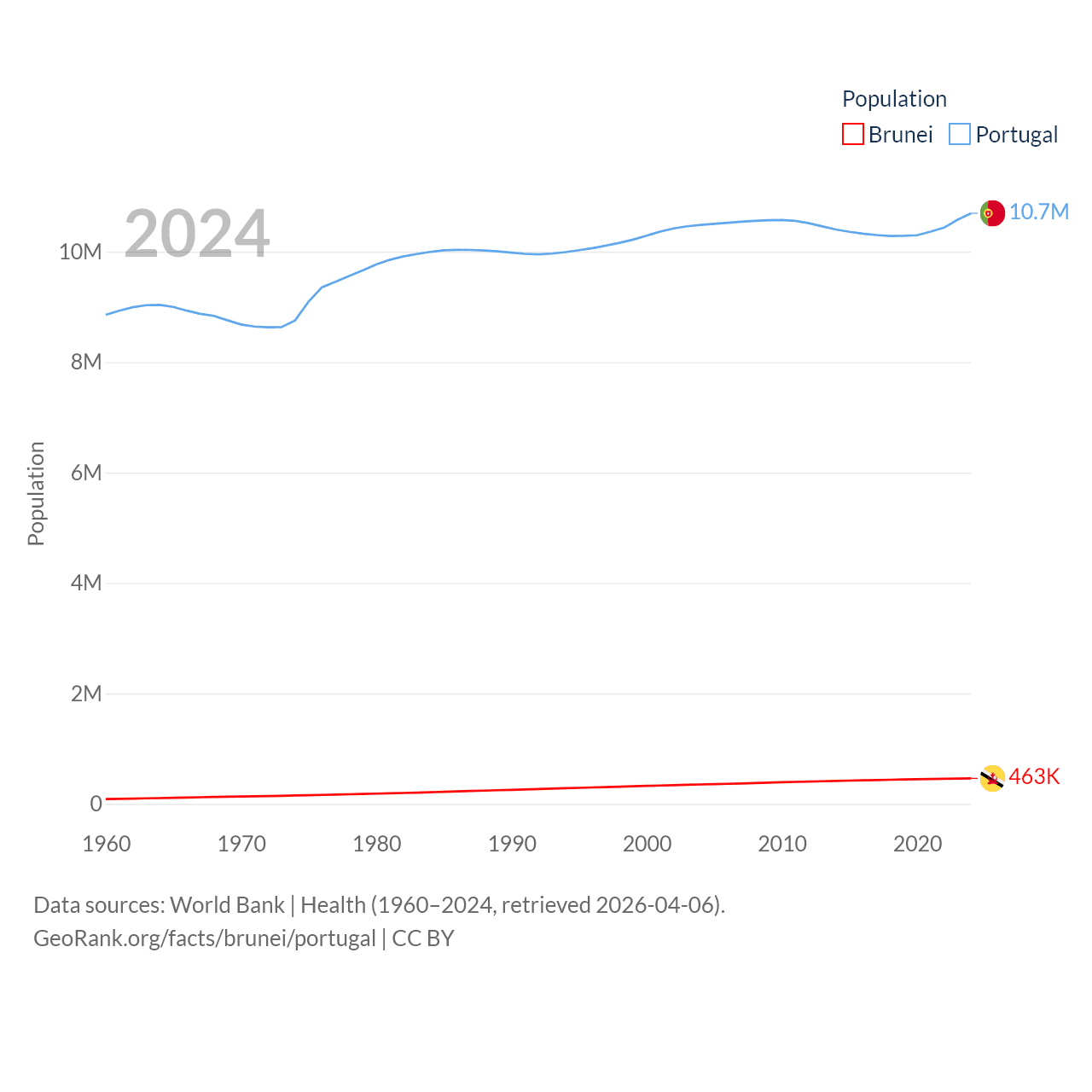 Brunei has a population of 463K (ranked 170/197), compared with 10.7M in Portugal (ranked 90/197). Brunei's land area is 2,035 sq mi versus 35,369 sq mi for Portugal (ranked 165th vs. 108th).