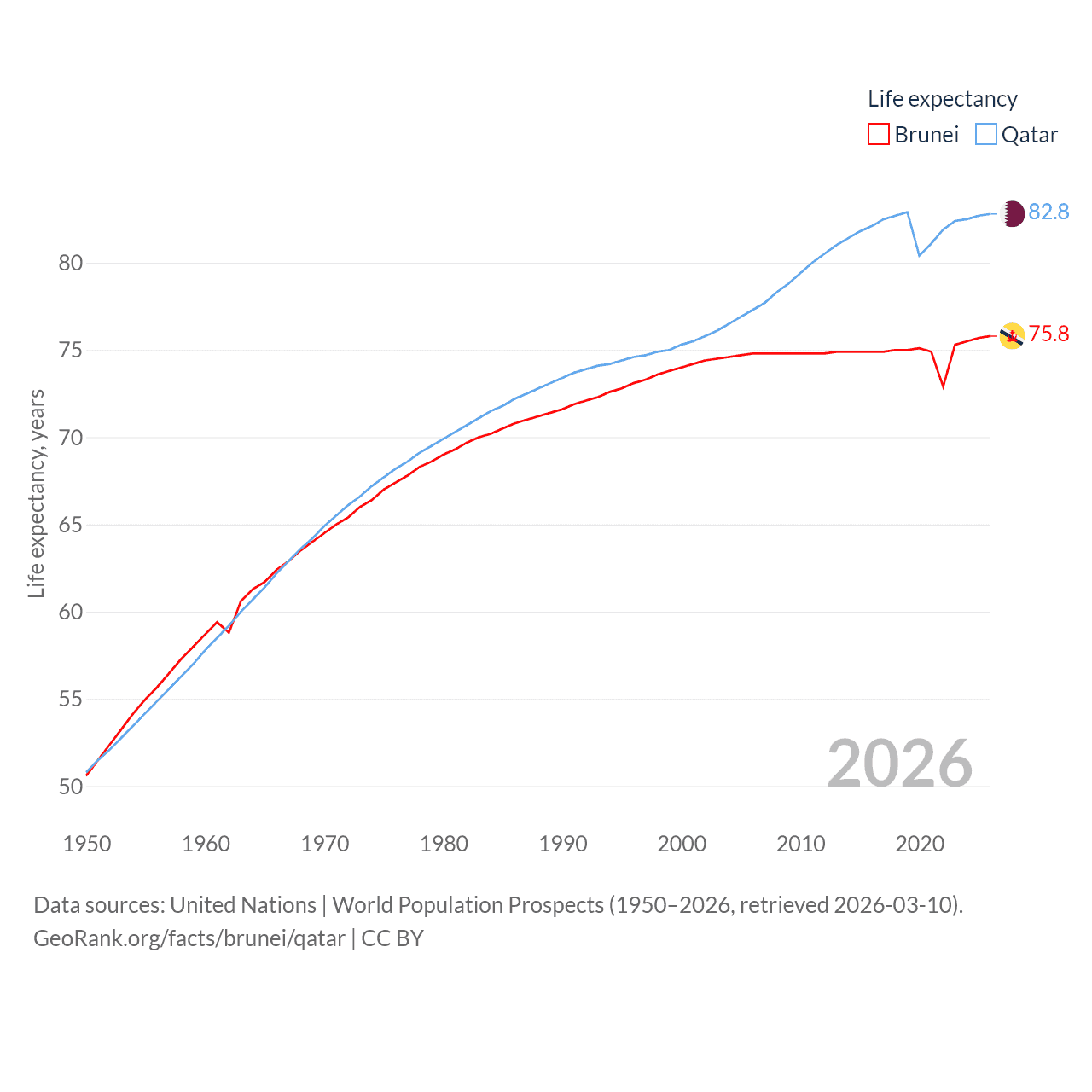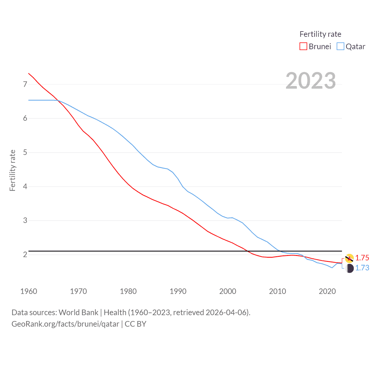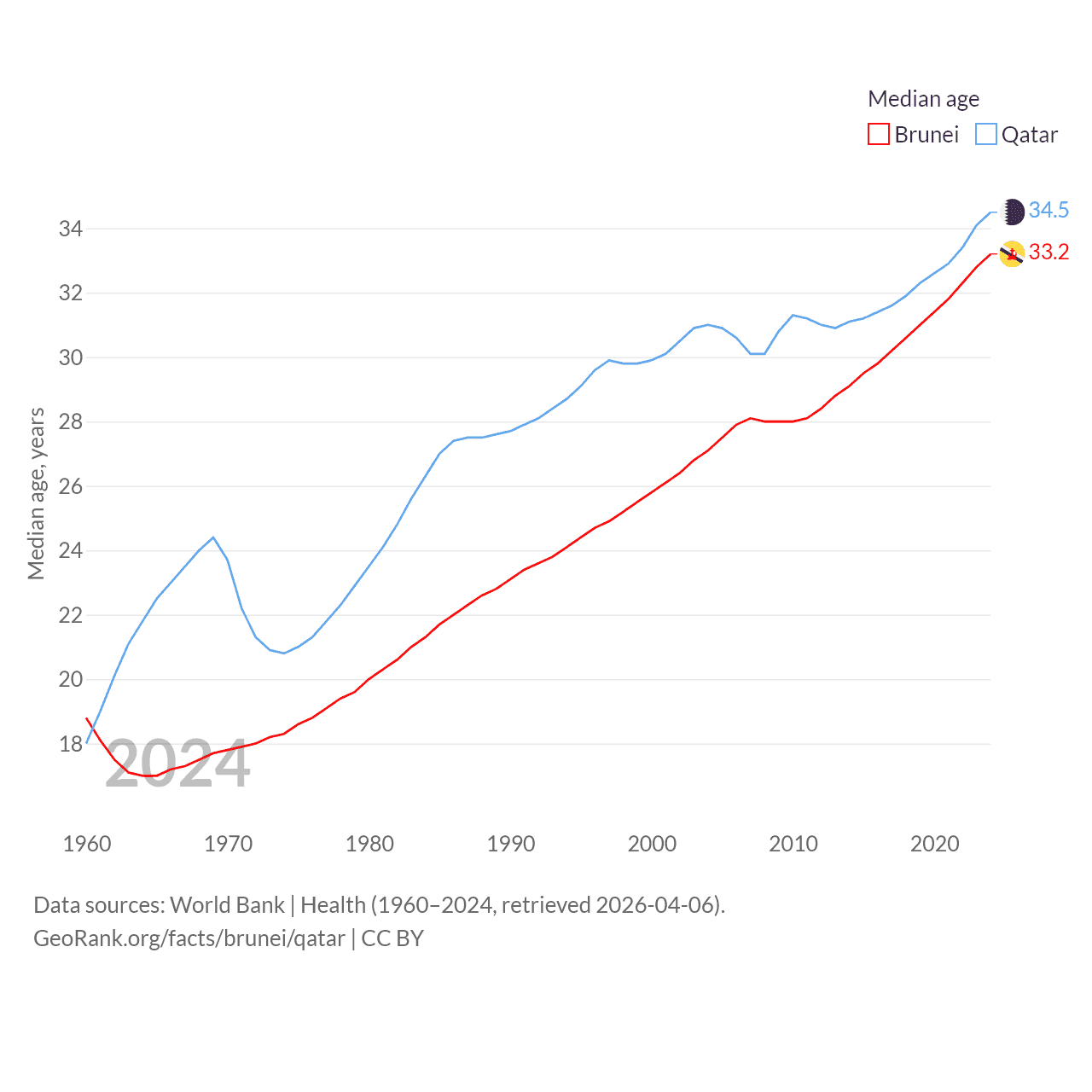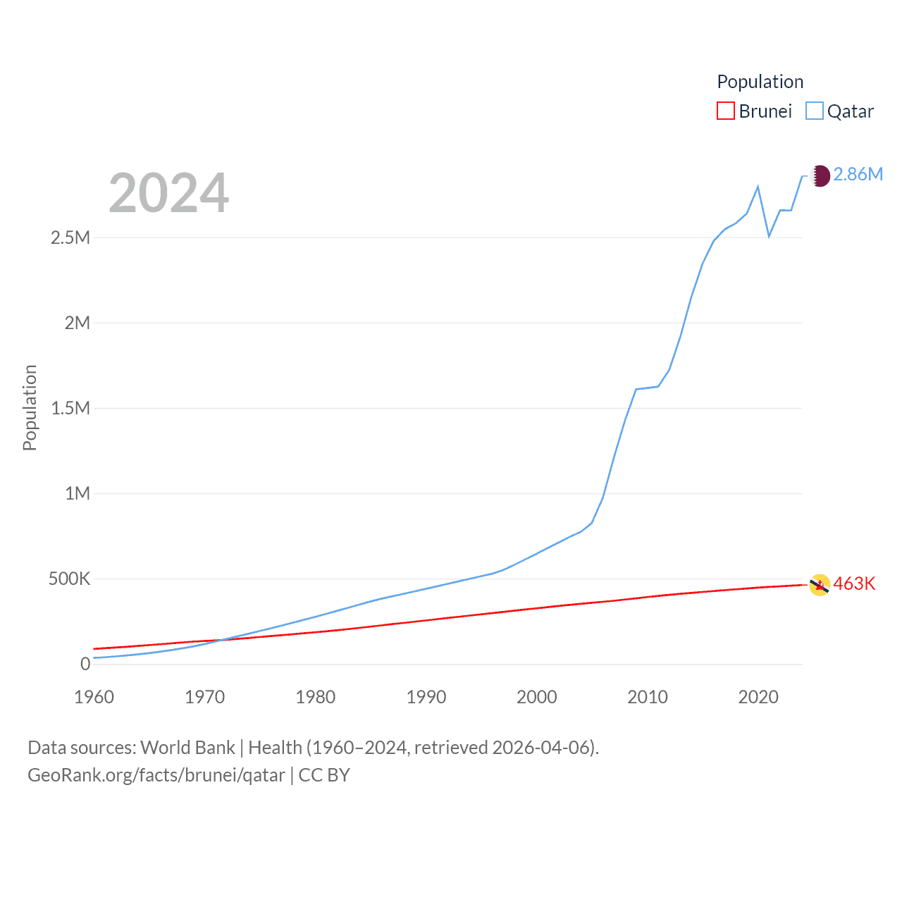 Brunei has a population of 463K (ranked 170/197), compared with 2.86M in Qatar (ranked 138/197). Brunei's land area is 2,035 sq mi versus 4,436 sq mi for Qatar (ranked 165th vs. 158th).
