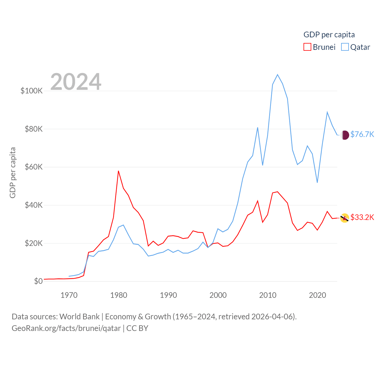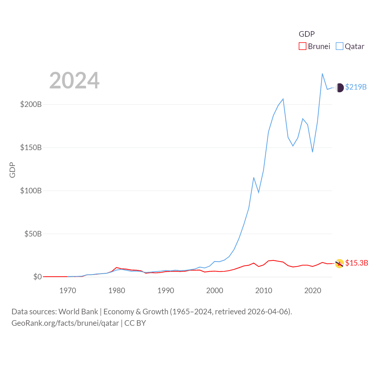 By GDP, Brunei ranks 142/197 ($15.3B) and Qatar ranks 56/197 ($219B). By GDP per capita, Brunei ranks 36/197 ($33,153), while Qatar ranks 11/197 ($76,689).