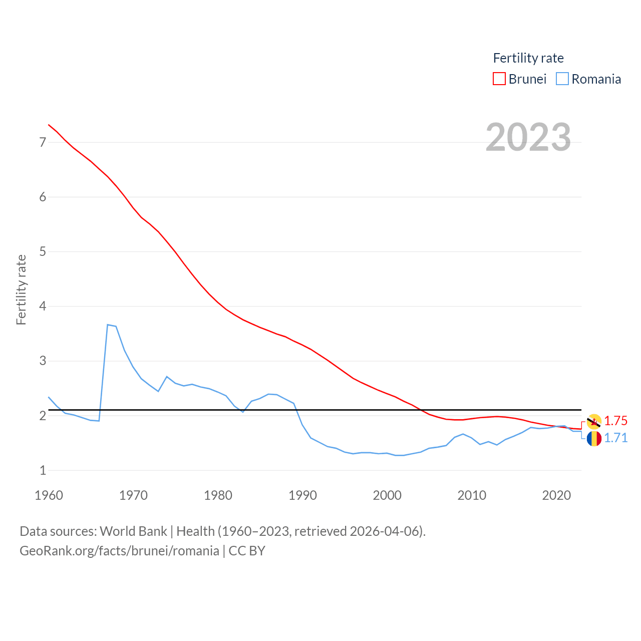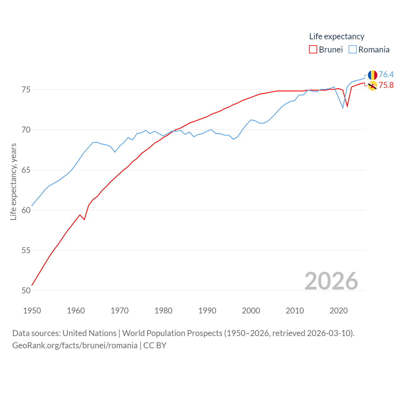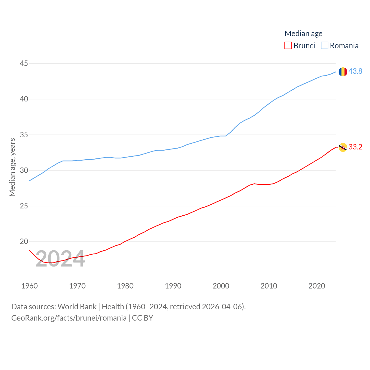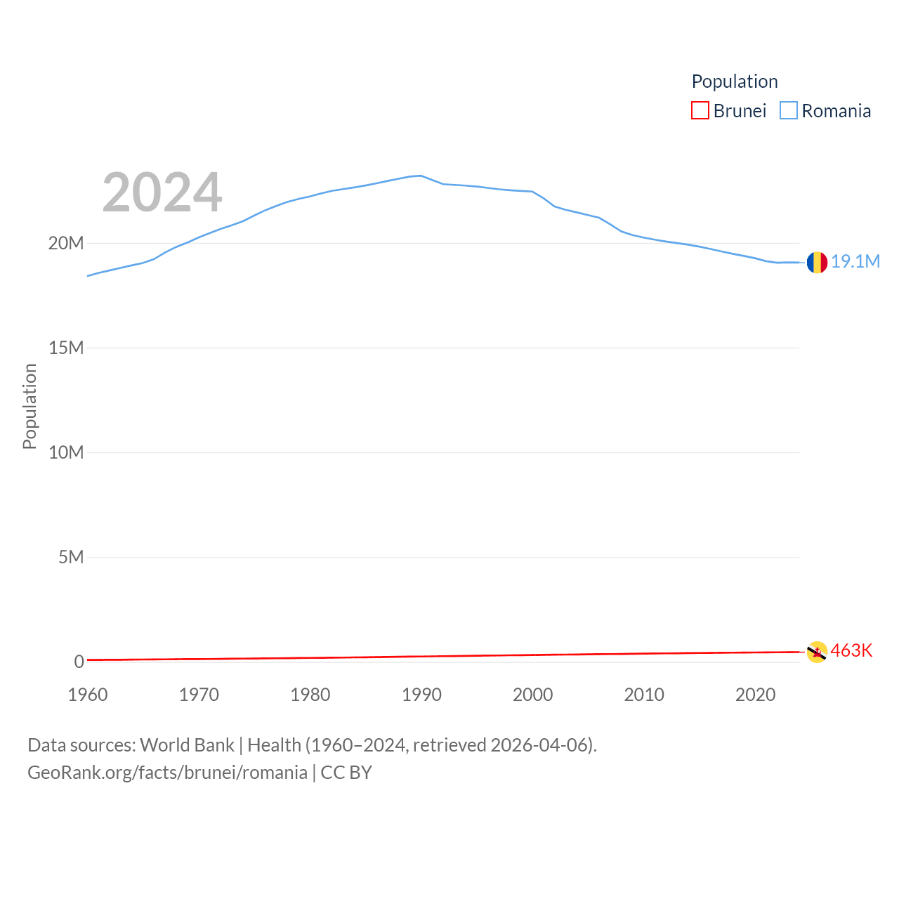 Brunei has a population of 463K (ranked 170/197), compared with 19.1M in Romania (ranked 67/197). Brunei's land area is 2,035 sq mi versus 88,834 sq mi for Romania (ranked 165th vs. 80th).