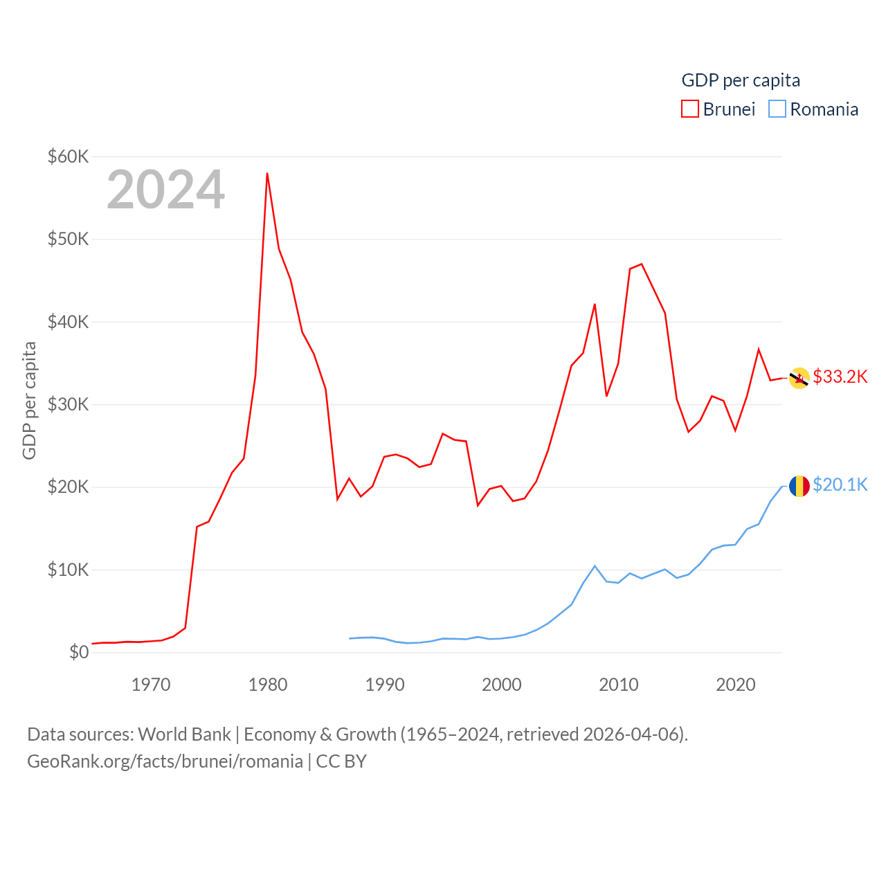 By GDP, Brunei ranks 142/197 ($15.3B) and Romania ranks 42/197 ($383B). By GDP per capita, Brunei ranks 36/197 ($33,153), while Romania ranks 58/197 ($20,080).