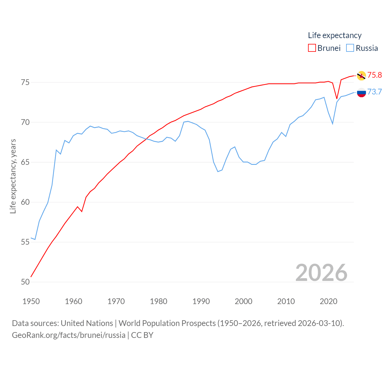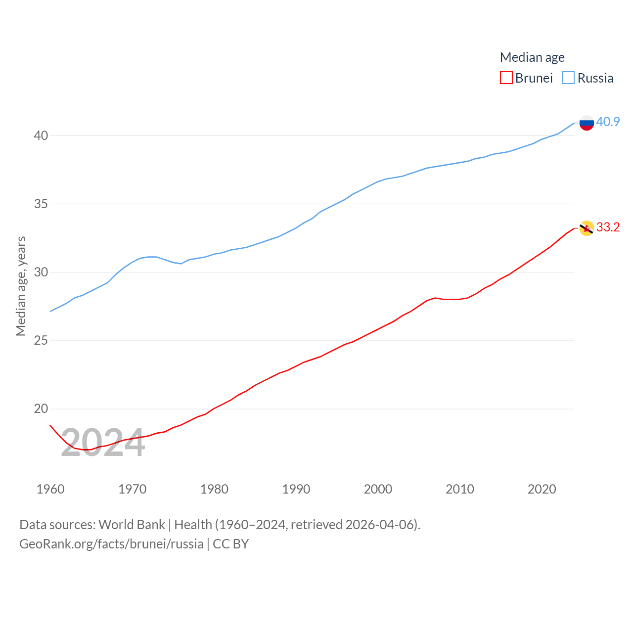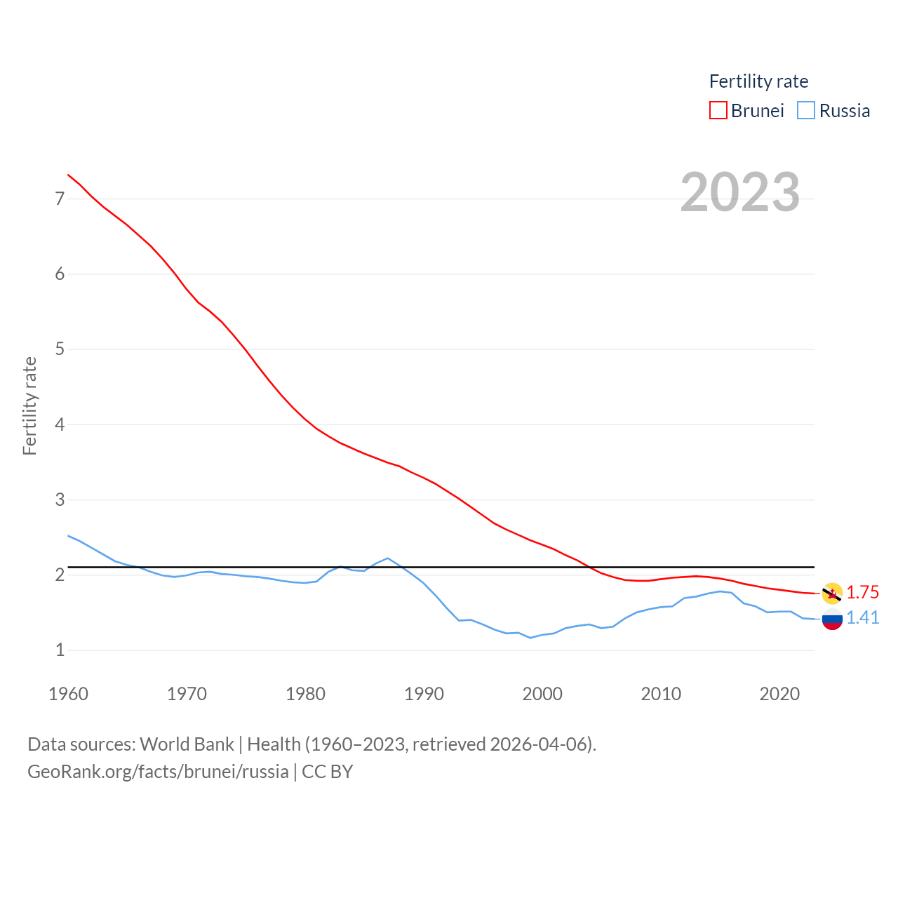 Brunei has a population of 463K (ranked 170/197), compared with 144M in Russia (ranked 9/197). Brunei's land area is 2,035 sq mi versus 6,323,145 sq mi for Russia (ranked 165th vs. 1st).