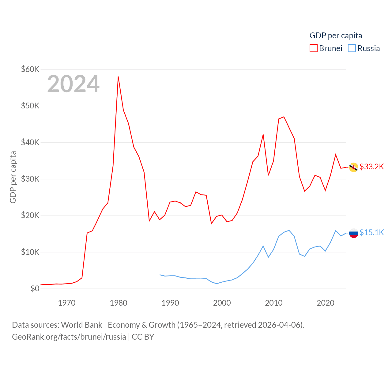 By GDP, Brunei ranks 142/197 ($15.3B) and Russia ranks 11/197 ($2.17T). By GDP per capita, Brunei ranks 36/197 ($33,153), while Russia ranks 68/197 ($15,145).