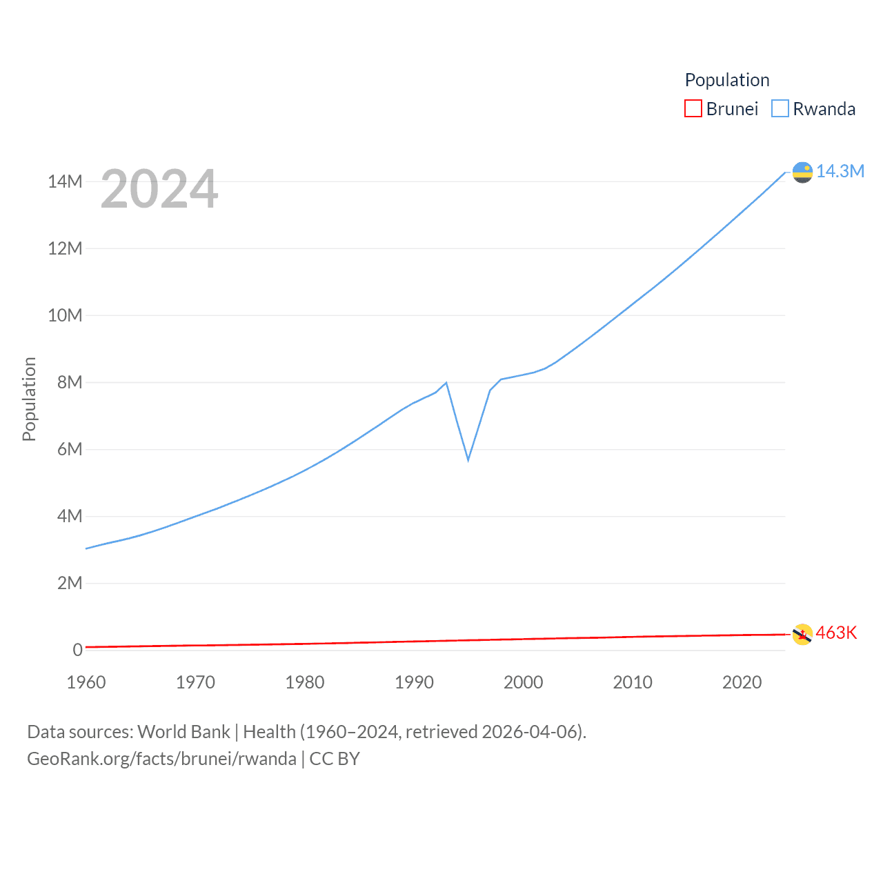 Brunei has a population of 463K (ranked 170/197), compared with 14.3M in Rwanda (ranked 77/197). Brunei's land area is 2,035 sq mi versus 9,525 sq mi for Rwanda (ranked 165th vs. 146th).