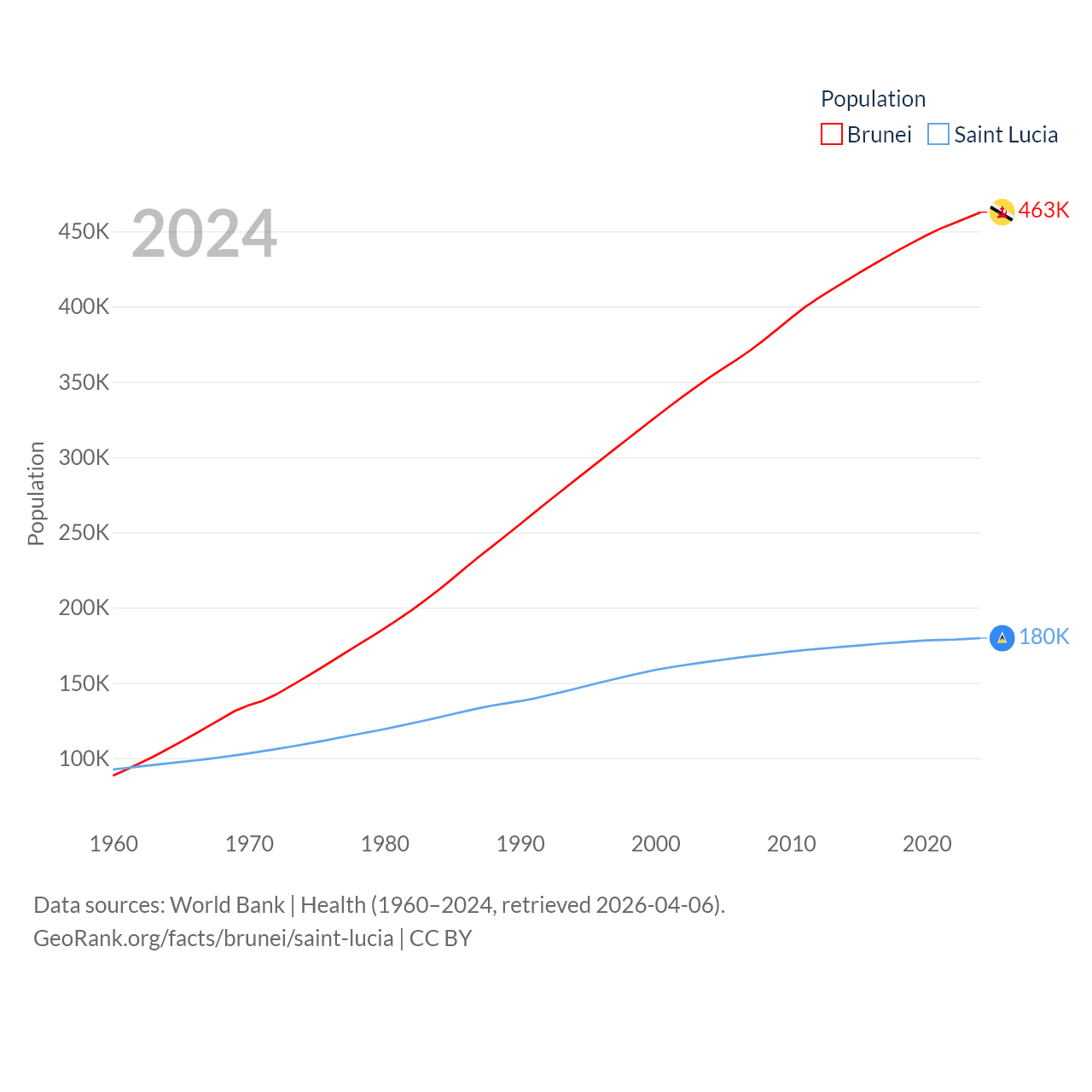 Brunei has a population of 463K (ranked 170/197), compared with 180K in Saint Lucia (ranked 178/197). Brunei's land area is 2,035 sq mi versus 235.5 sq mi for Saint Lucia (ranked 165th vs. 178th).