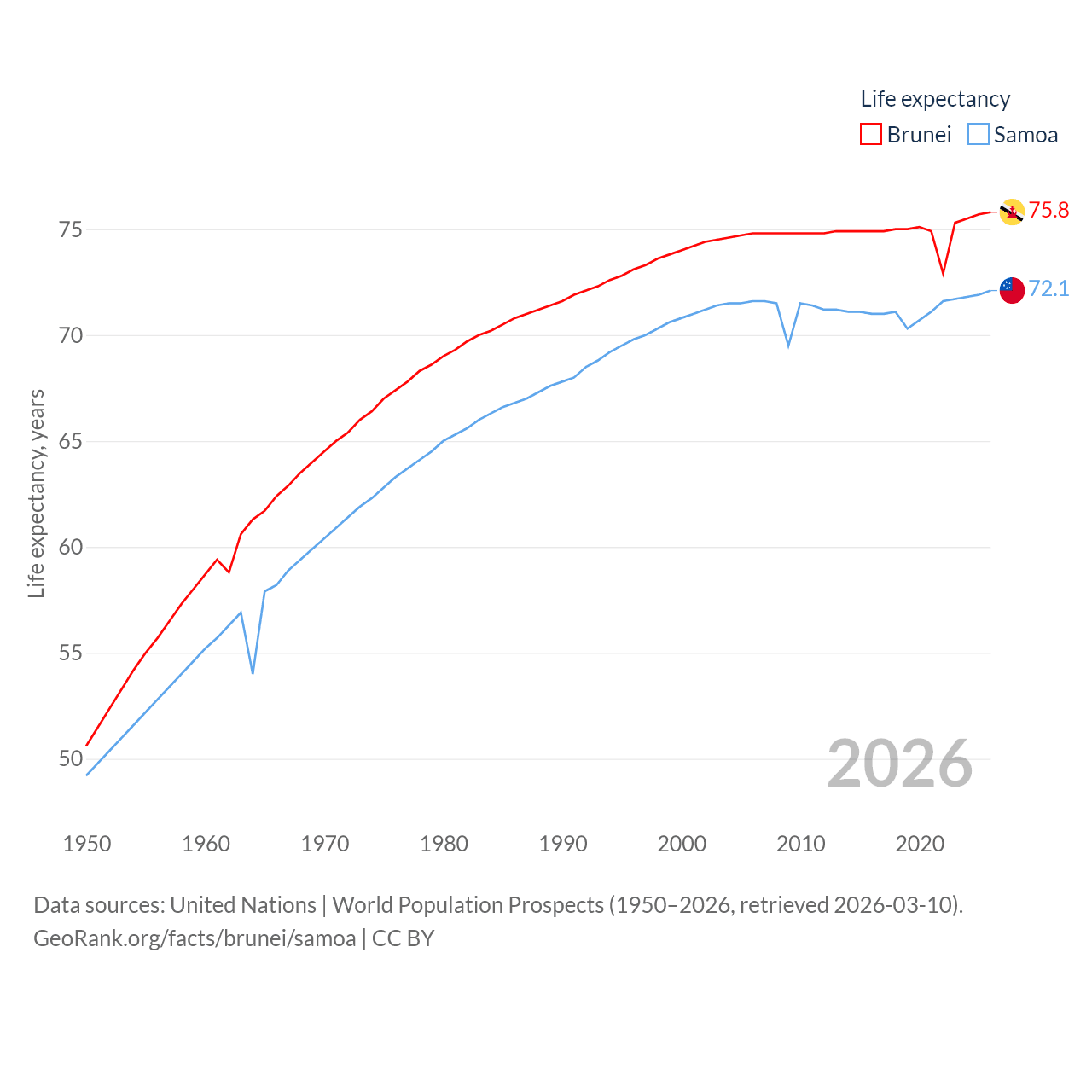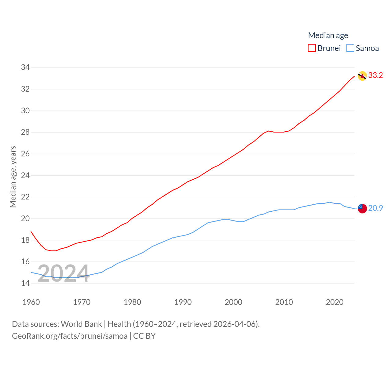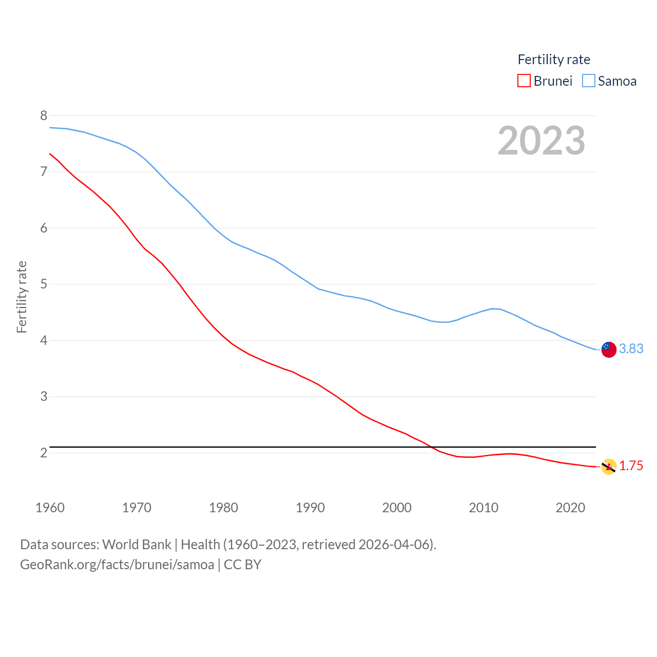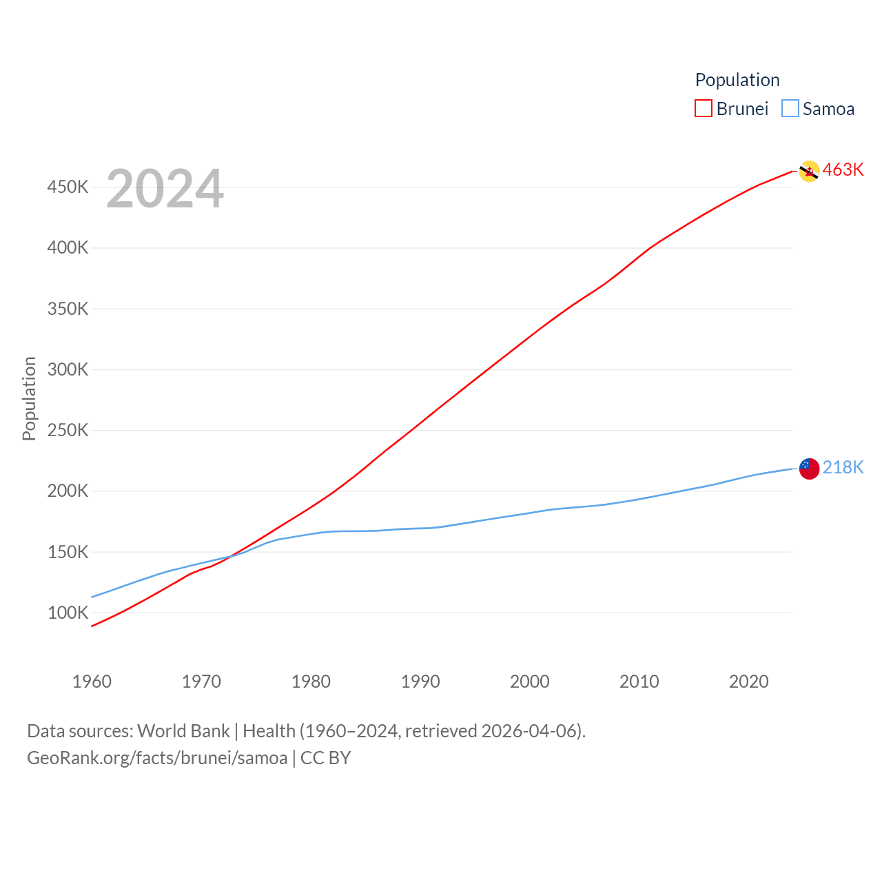 Brunei has a population of 463K (ranked 170/197), compared with 218K in Samoa (ranked 177/197). Brunei's land area is 2,035 sq mi versus 1,073 sq mi for Samoa (ranked 165th vs. 168th).
