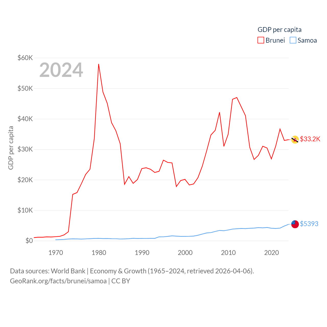 By GDP, Brunei ranks 142/197 ($15.3B) and Samoa ranks 185/197 ($1.18B). By GDP per capita, Brunei ranks 36/197 ($33,153), while Samoa ranks 117/197 ($5,393).