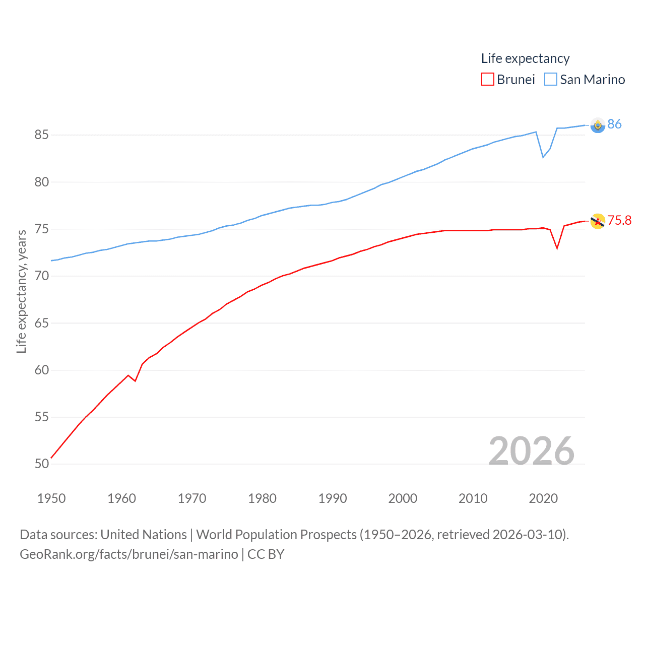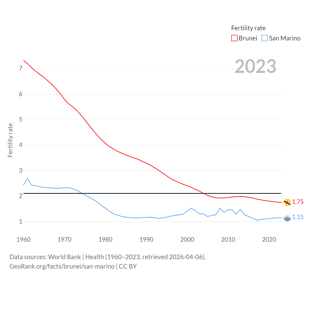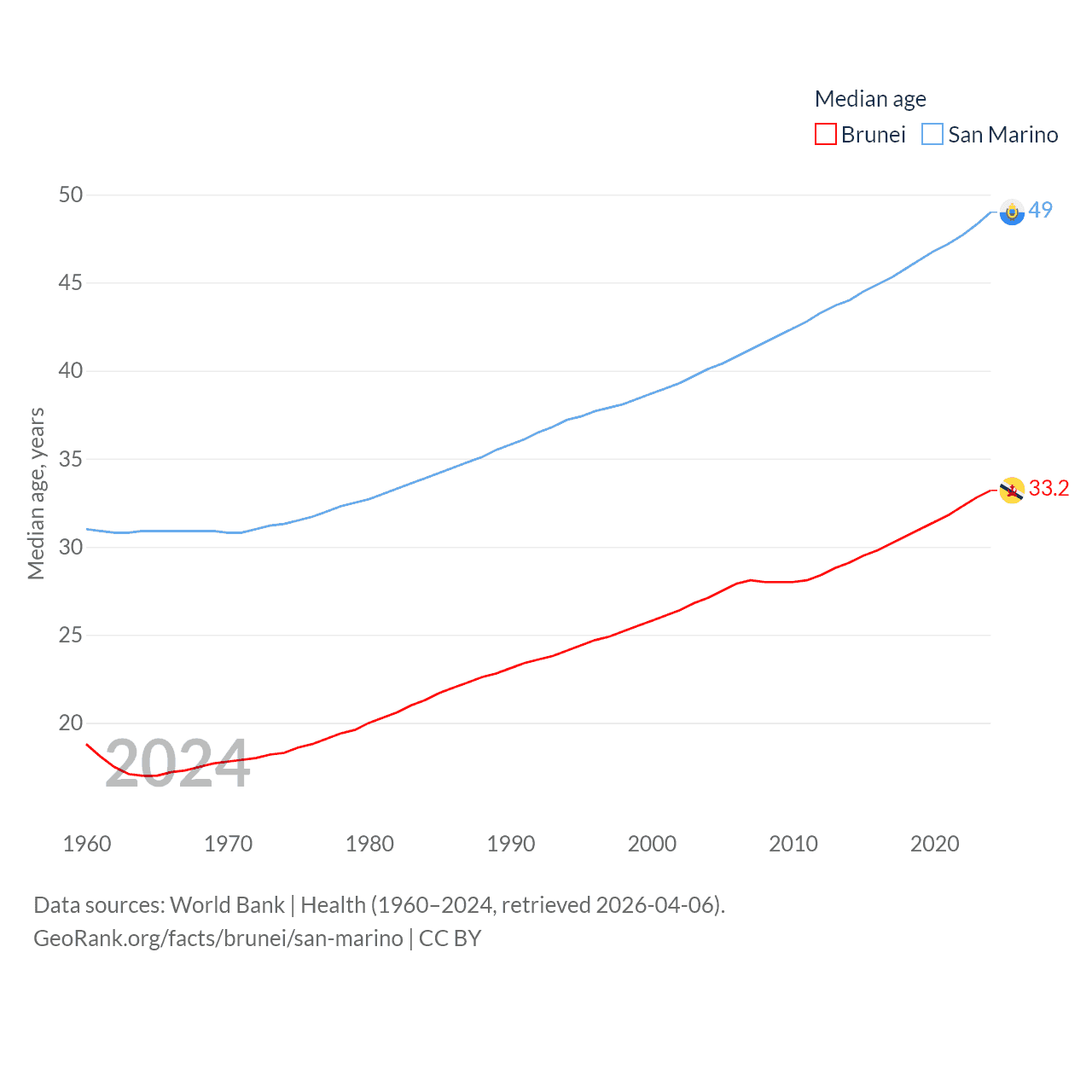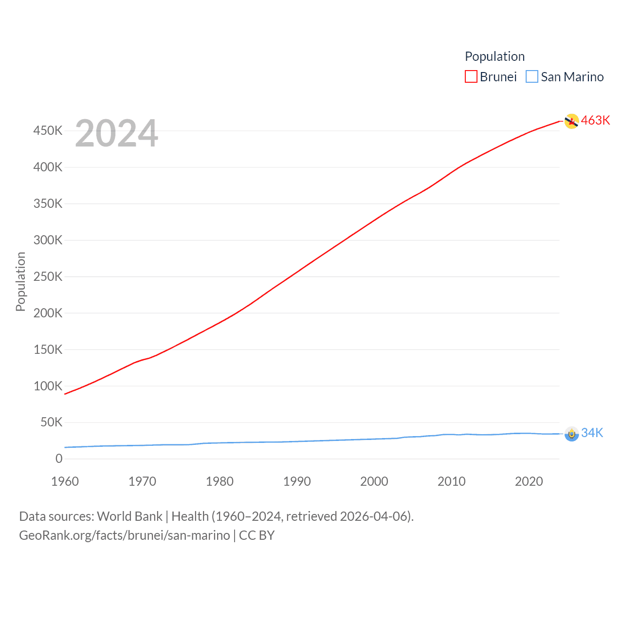Brunei has a population of 463K (ranked 170/197), compared with 34K in San Marino (ranked 193/197). Brunei's land area is 2,035 sq mi versus 23.2 sq mi for San Marino (ranked 165th vs. 193rd).