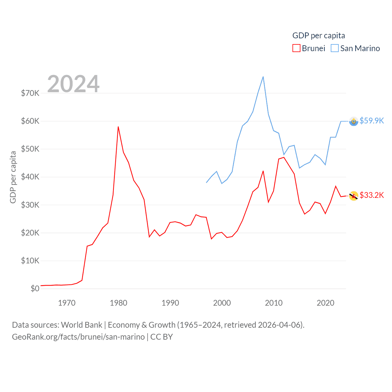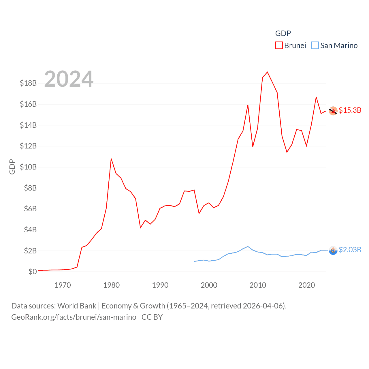 By GDP, Brunei ranks 142/197 ($15.3B) and San Marino ranks 180/197 ($2.03B). By GDP per capita, Brunei ranks 36/197 ($33,153), while San Marino ranks 15/197 ($59,880).