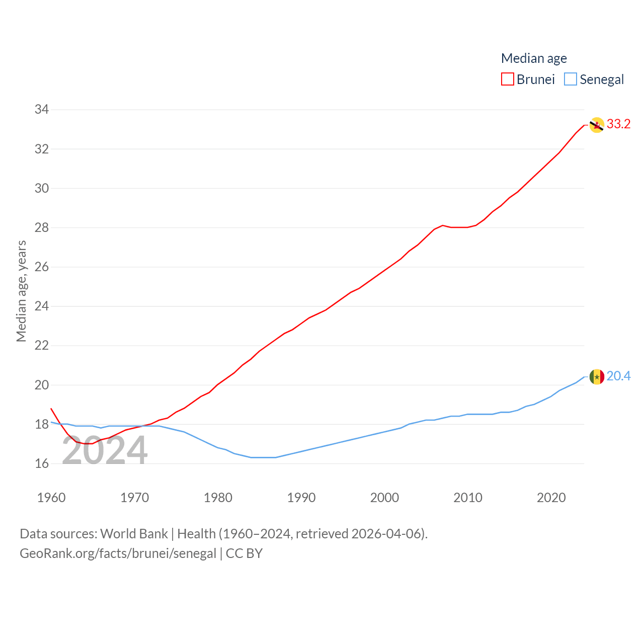 Brunei has a population of 463K (ranked 170/197), compared with 18.5M in Senegal (ranked 69/197). Brunei's land area is 2,035 sq mi versus 74,336 sq mi for Senegal (ranked 165th vs. 85th).