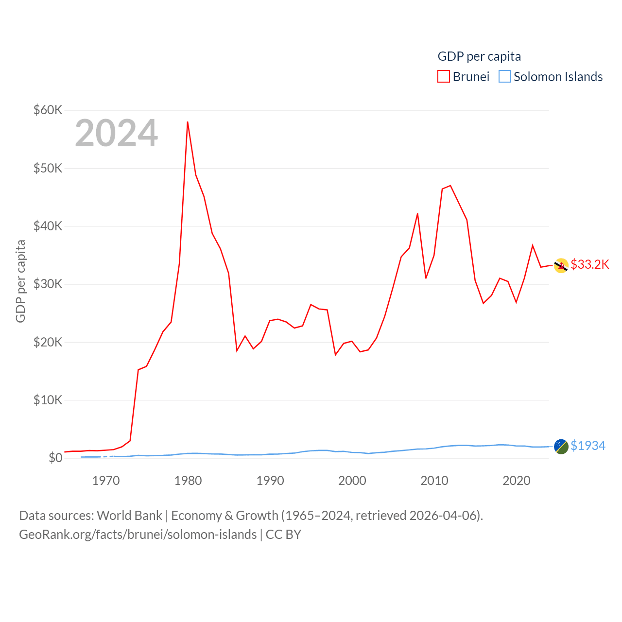 By GDP, Brunei ranks 142/197 ($15.3B) and The Solomon Islands ranks 182/197 ($1.58B). By GDP per capita, Brunei ranks 36/197 ($33,153), while The Solomon Islands ranks 157/197 ($1,934).