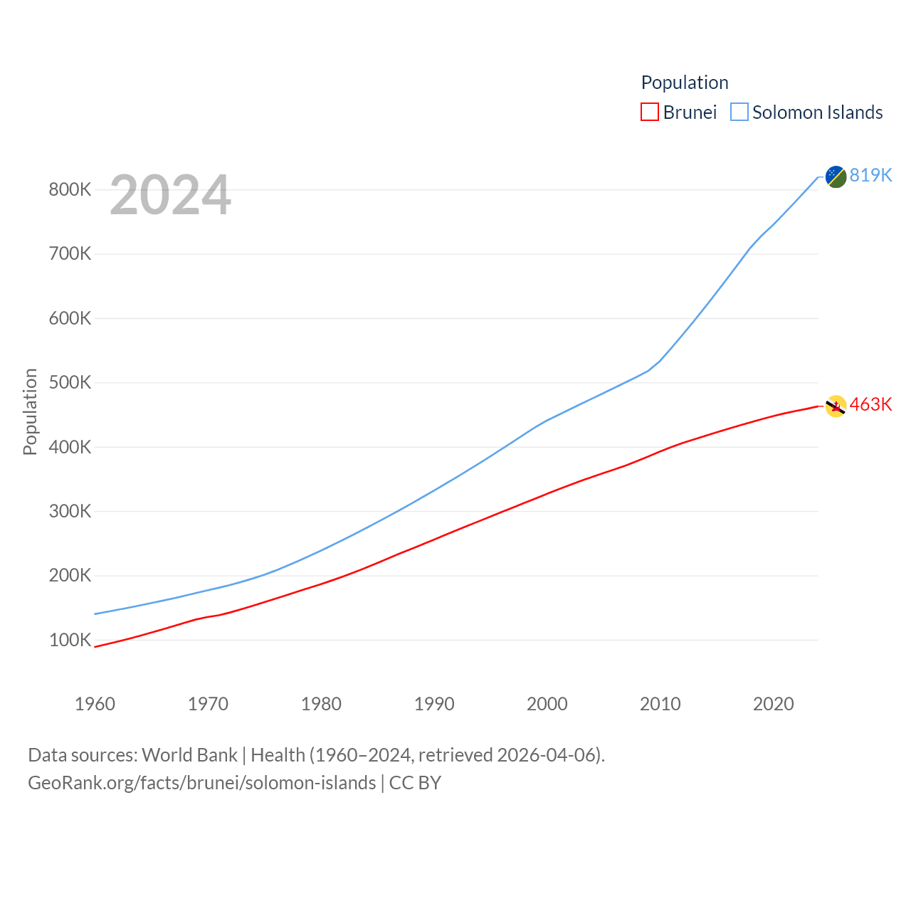 Brunei has a population of 463K (ranked 170/197), compared with 819K in The Solomon Islands (ranked 162/197). Brunei's land area is 2,035 sq mi versus 10,807 sq mi for The Solomon Islands (ranked 165th vs. 141st).