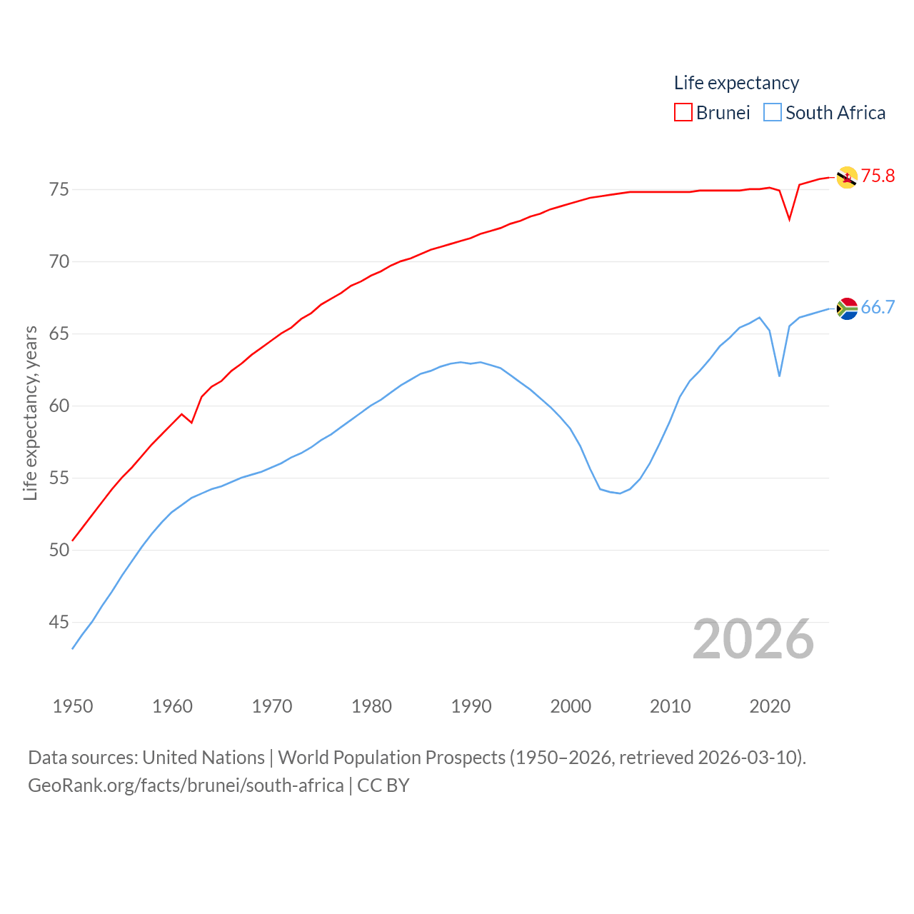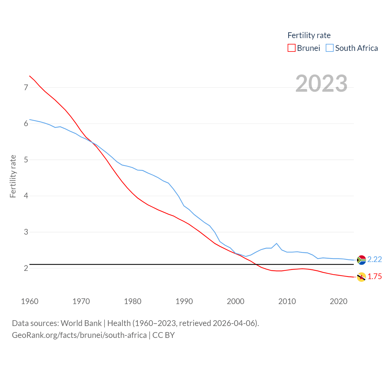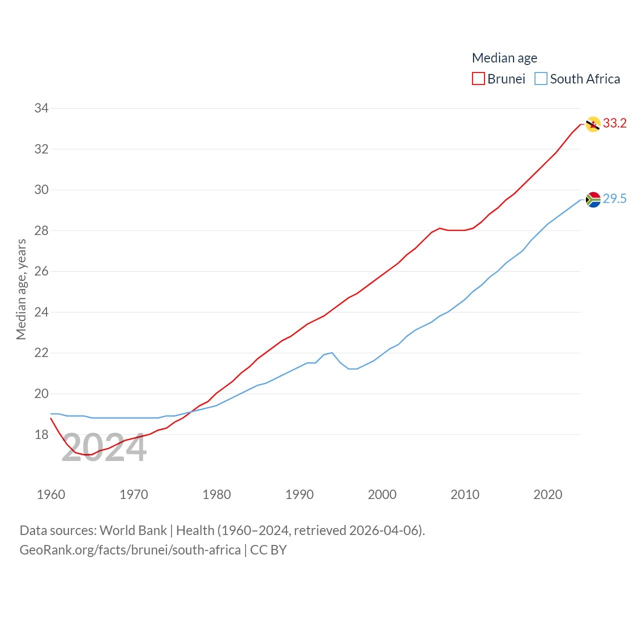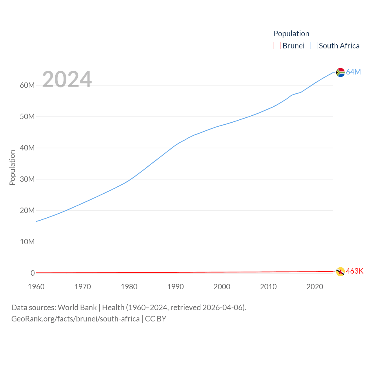 Brunei has a population of 463K (ranked 170/197), compared with 64M in South Africa (ranked 24/197). Brunei's land area is 2,035 sq mi versus 468,377 sq mi for South Africa (ranked 165th vs. 24th).