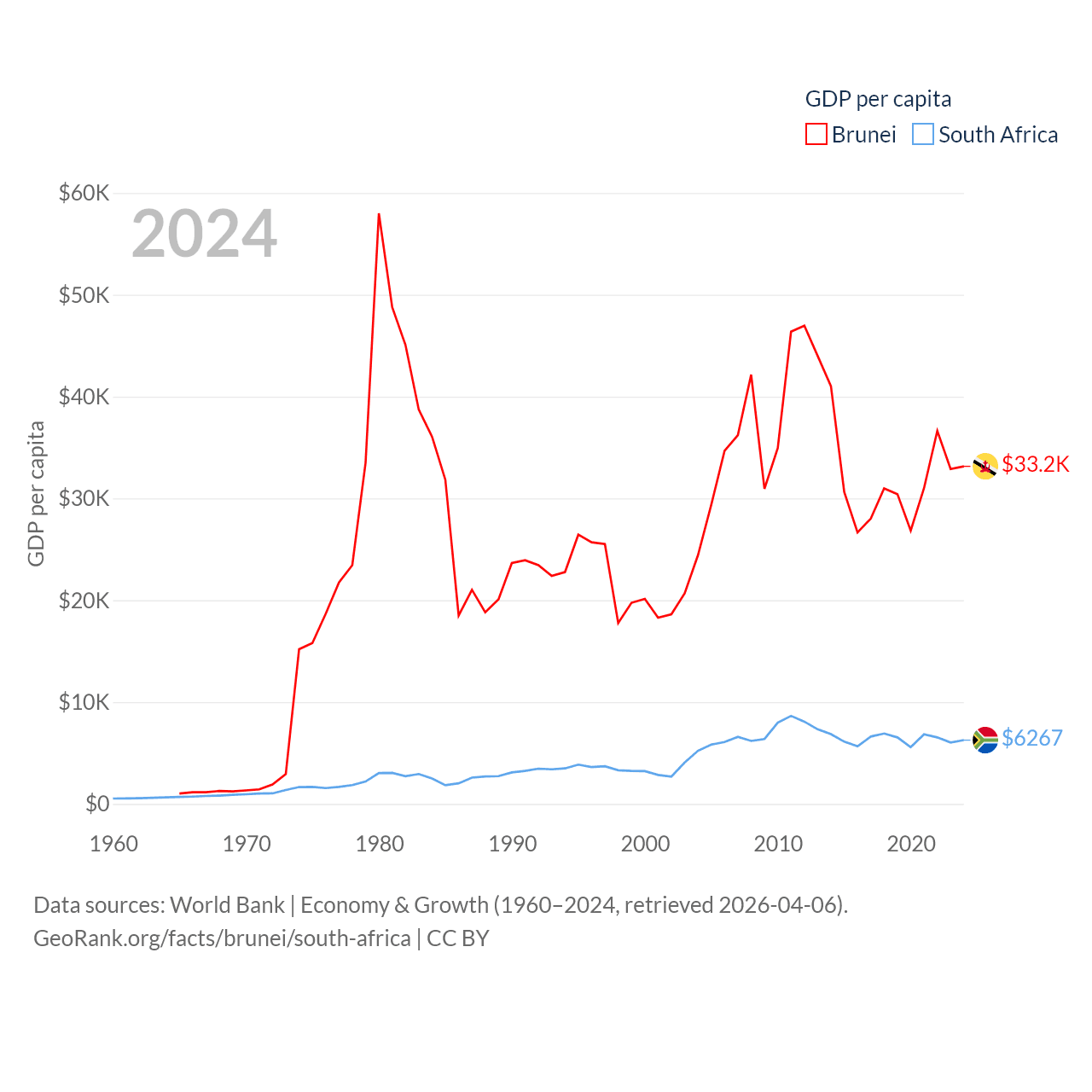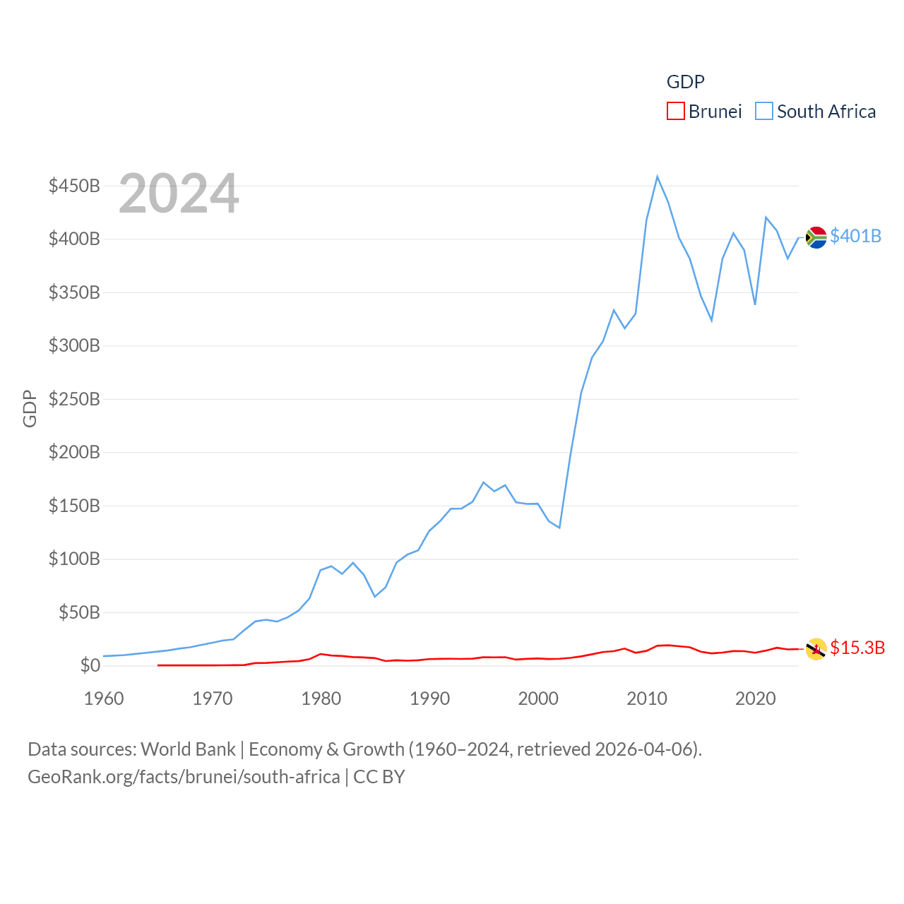 By GDP, Brunei ranks 142/197 ($15.3B) and South Africa ranks 40/197 ($401B). By GDP per capita, Brunei ranks 36/197 ($33,153), while South Africa ranks 111/197 ($6,267).