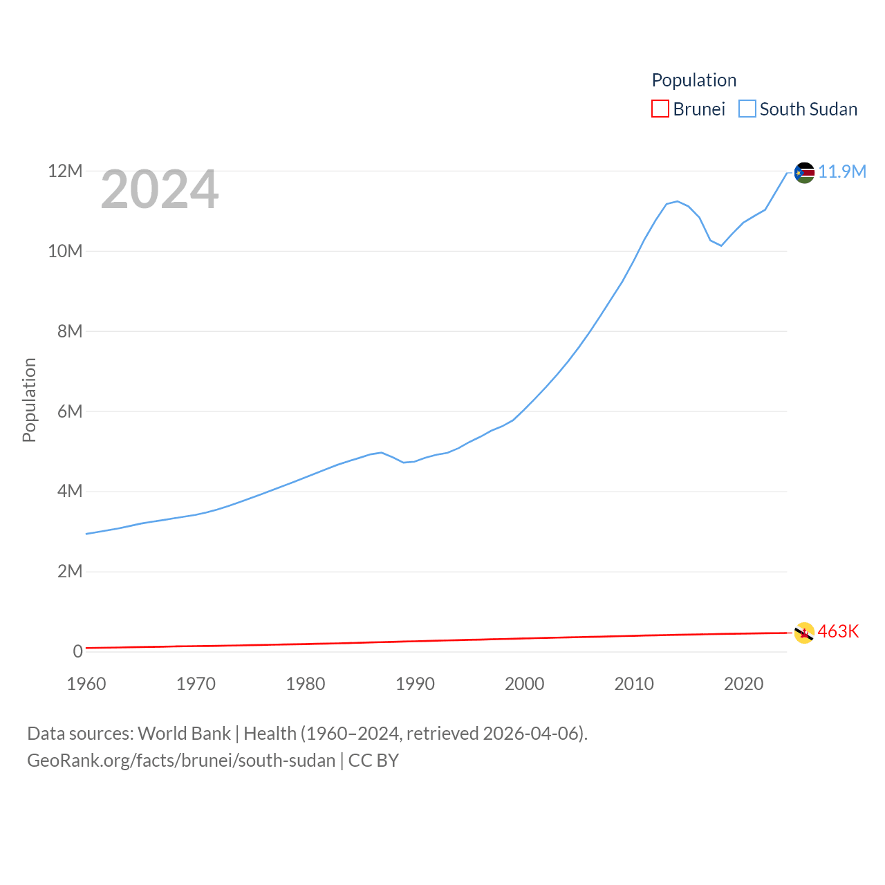 Brunei has a population of 463K (ranked 170/197), compared with 11.9M in South Sudan (ranked 81/197). Brunei's land area is 2,035 sq mi versus 243,990 sq mi for South Sudan (ranked 165th vs. 41st).