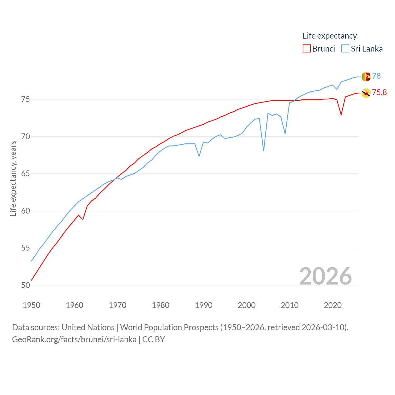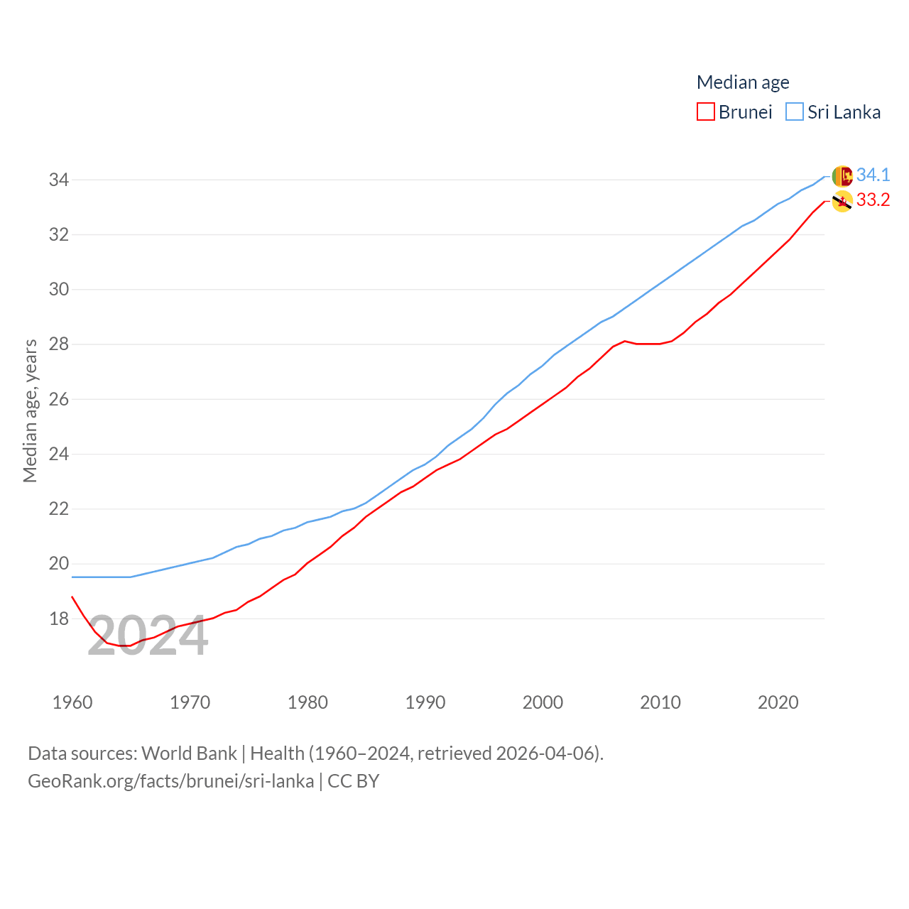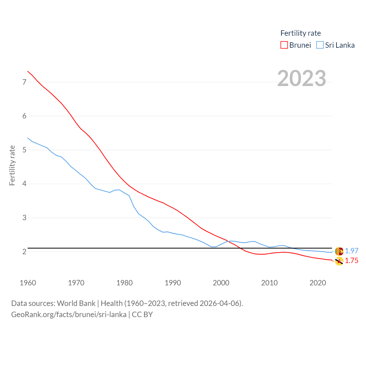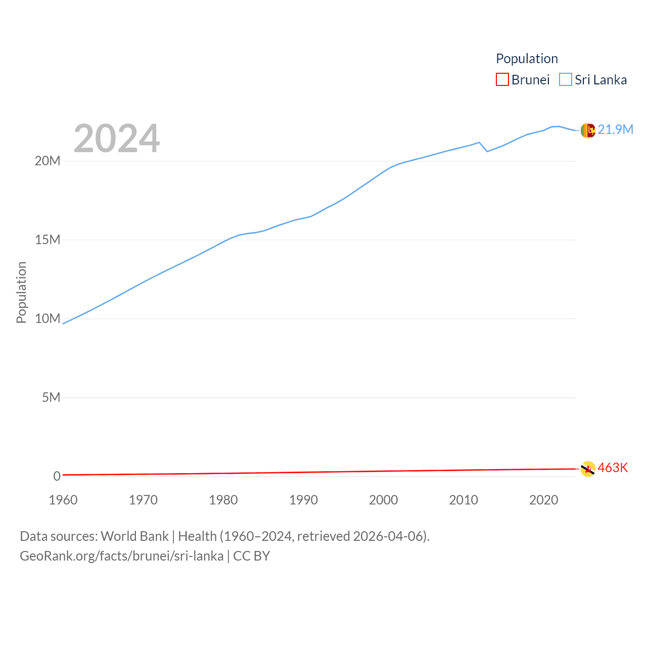 Brunei has a population of 463K (ranked 170/197), compared with 21.9M in Sri Lanka (ranked 61/197). Brunei's land area is 2,035 sq mi versus 23,884 sq mi for Sri Lanka (ranked 165th vs. 122nd).