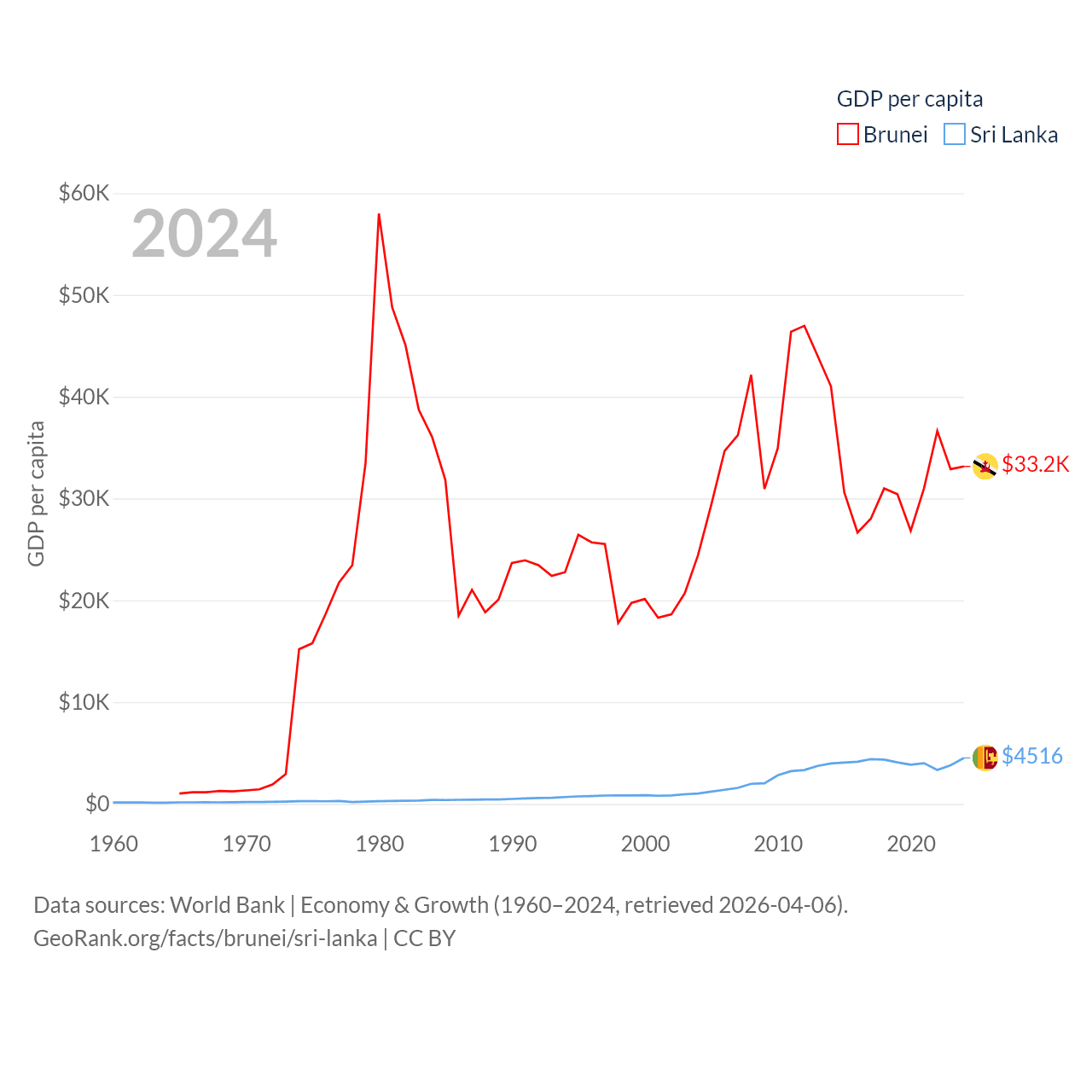 By GDP, Brunei ranks 142/197 ($15.3B) and Sri Lanka ranks 72/197 ($99B). By GDP per capita, Brunei ranks 36/197 ($33,153), while Sri Lanka ranks 124/197 ($4,516).