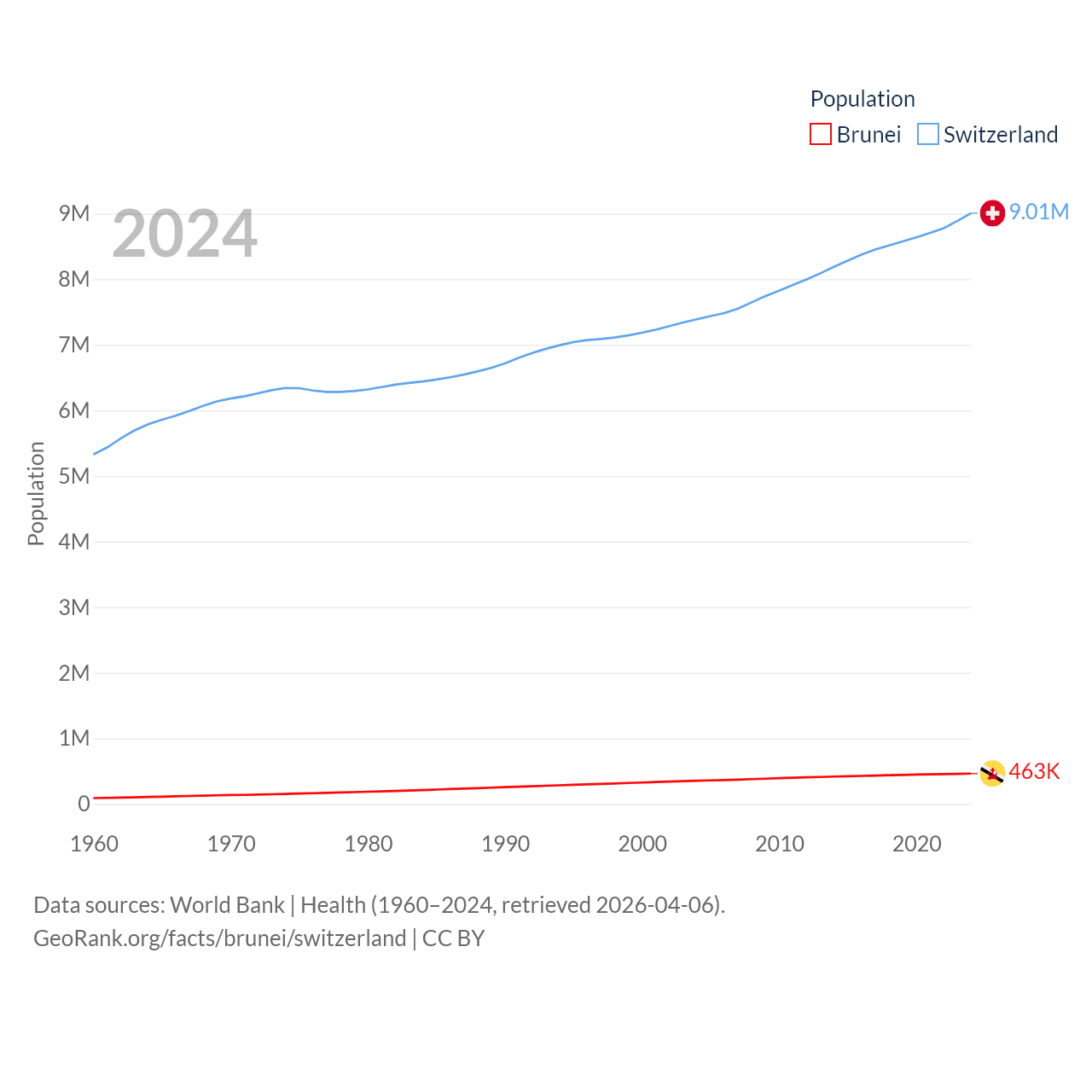 Brunei has a population of 463K (ranked 170/197), compared with 9.01M in Switzerland (ranked 101/197). Brunei's land area is 2,035 sq mi versus 15,255 sq mi for Switzerland (ranked 165th vs. 131st).