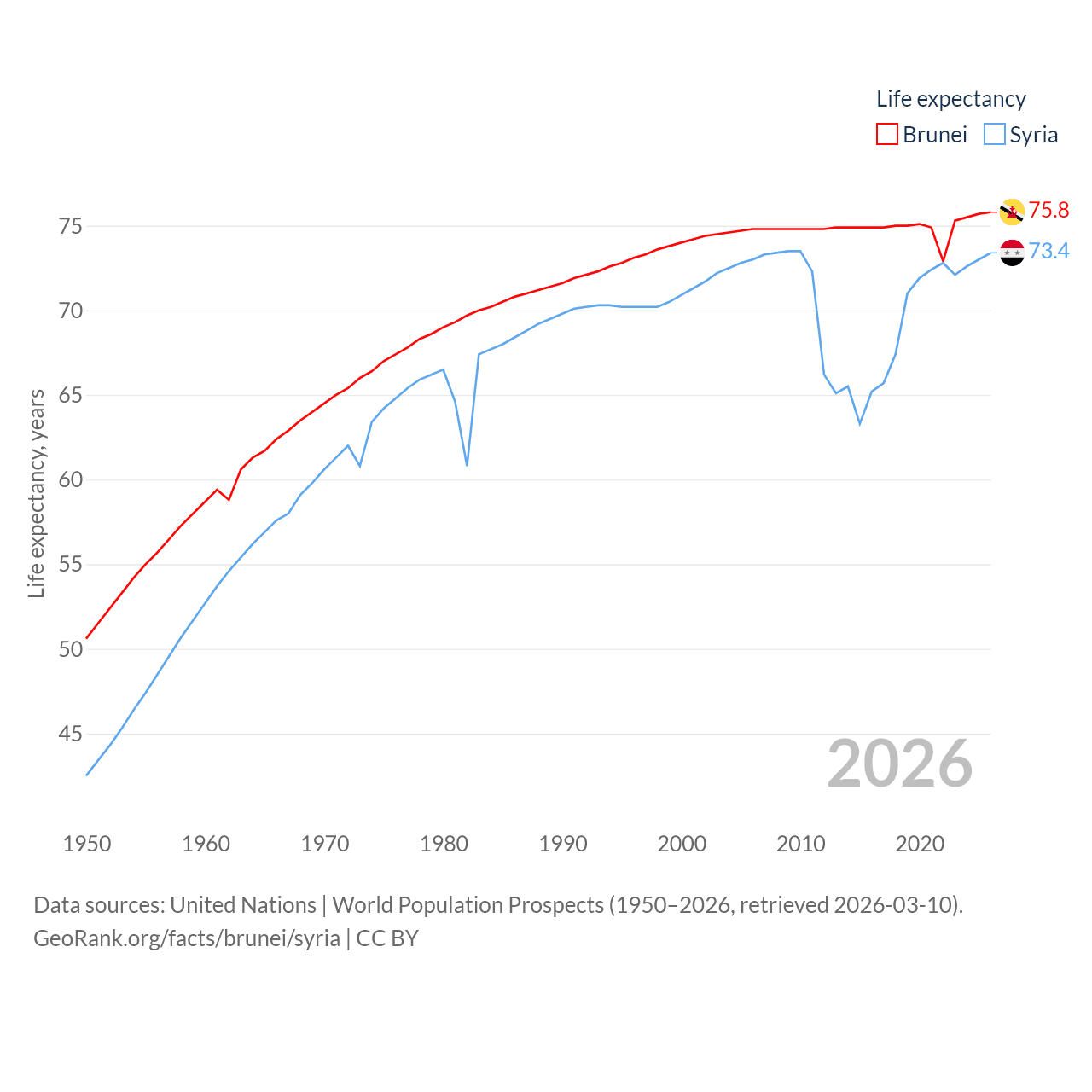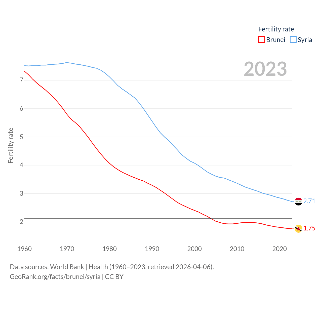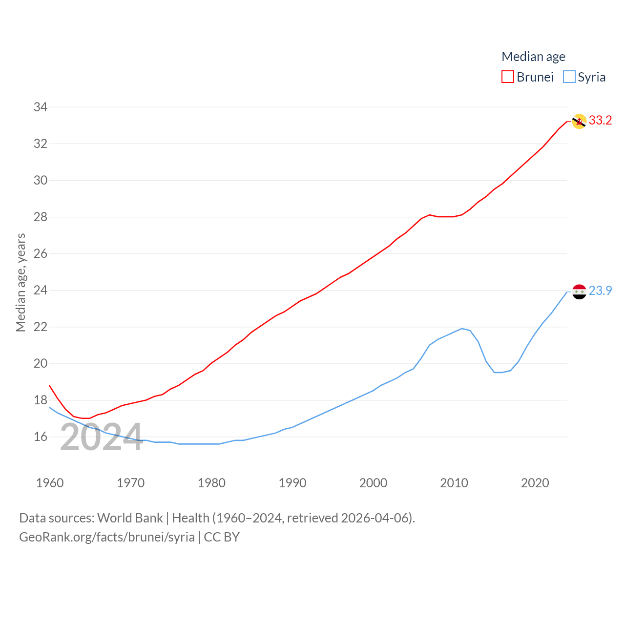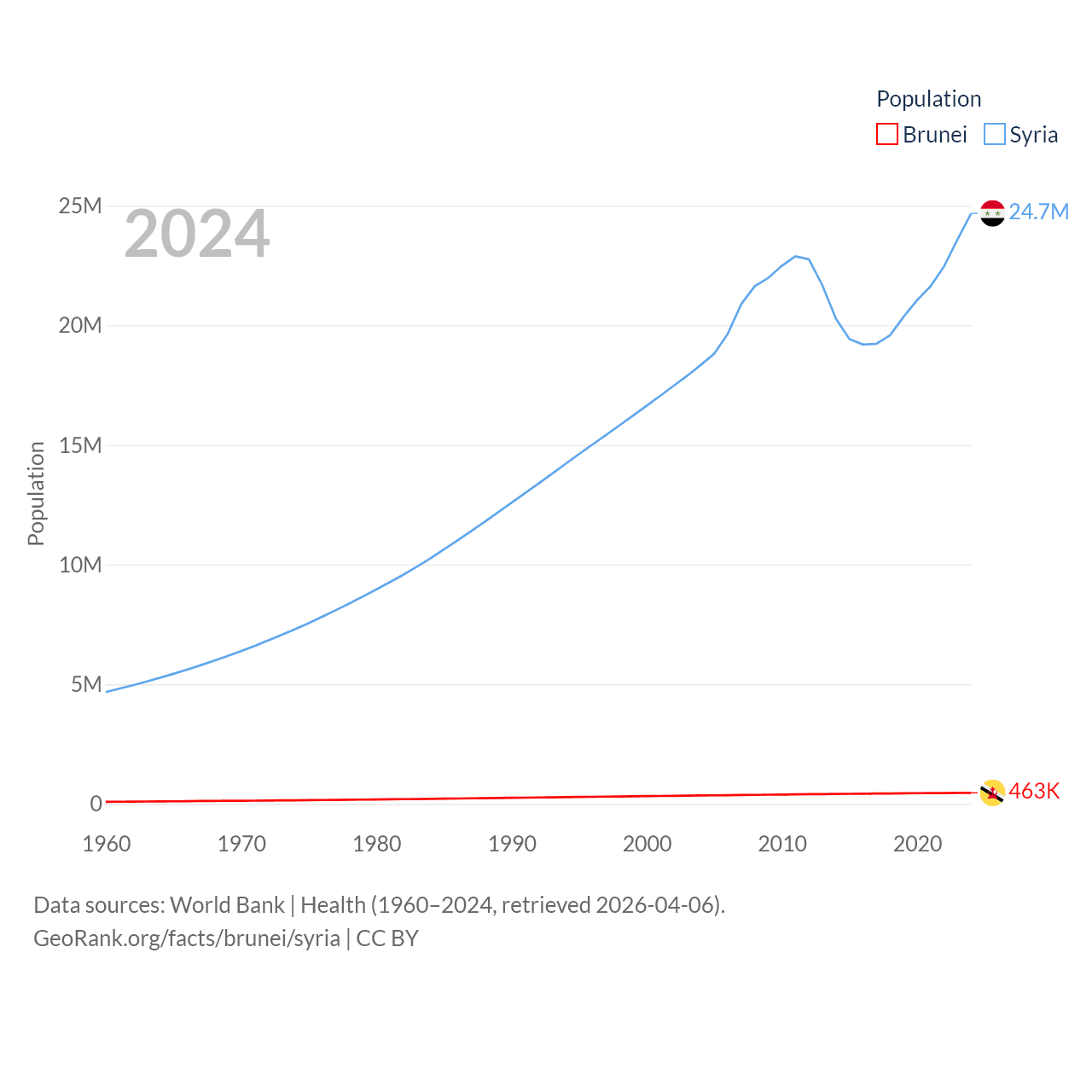 Brunei has a population of 463K (ranked 170/197), compared with 24.7M in Syria (ranked 57/197). Brunei's land area is 2,035 sq mi versus 70,900 sq mi for Syria (ranked 165th vs. 87th).