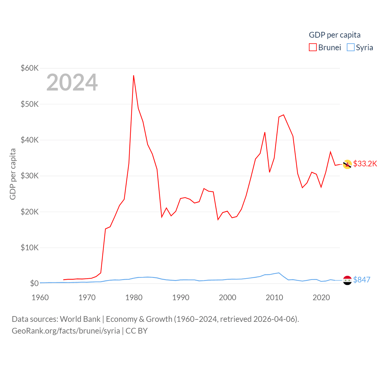 By GDP, Brunei ranks 142/197 ($15.3B) and Syria ranks 129/197 ($20B). By GDP per capita, Brunei ranks 36/197 ($33,153), while Syria ranks 185/197 ($847).