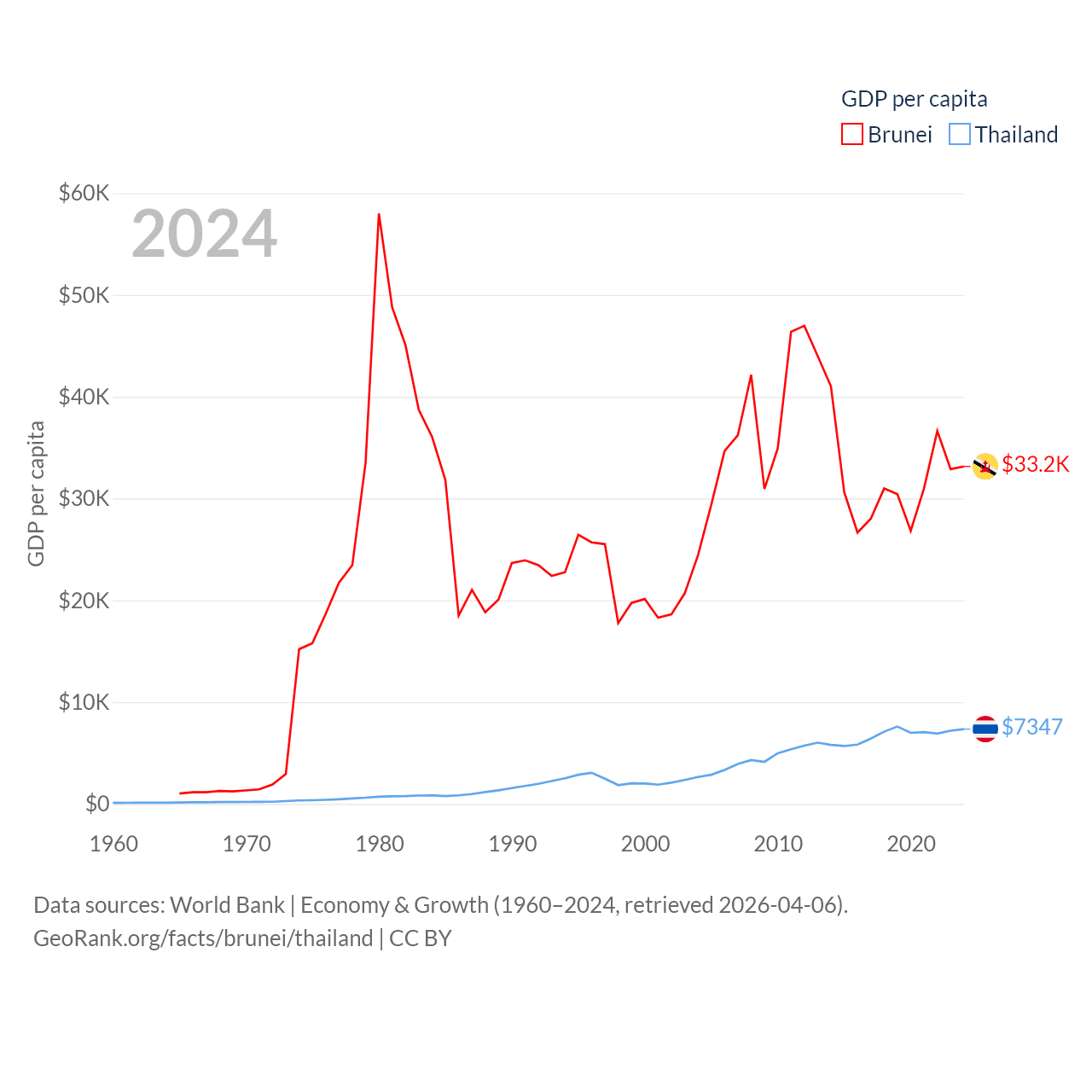 By GDP, Brunei ranks 142/197 ($15.3B) and Thailand ranks 31/197 ($527B). By GDP per capita, Brunei ranks 36/197 ($33,153), while Thailand ranks 100/197 ($7,347).