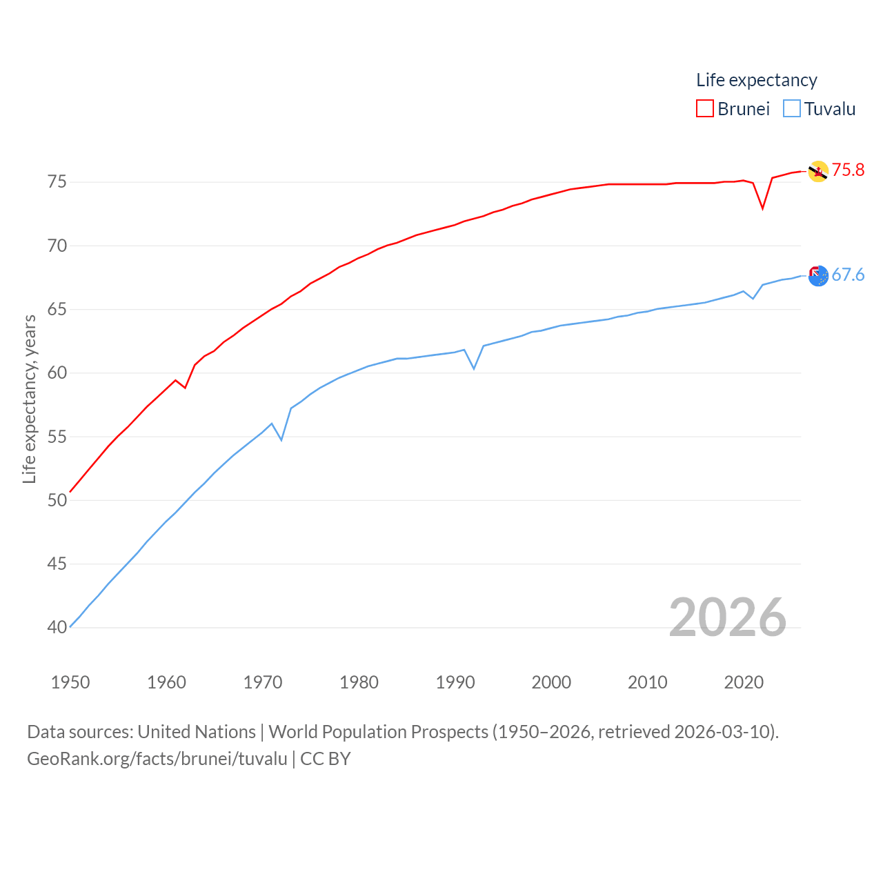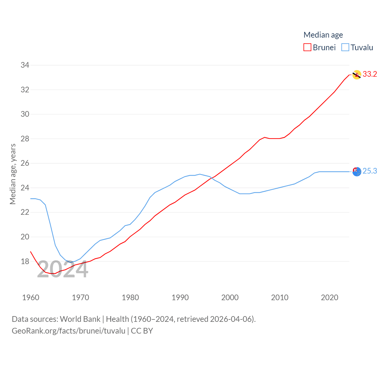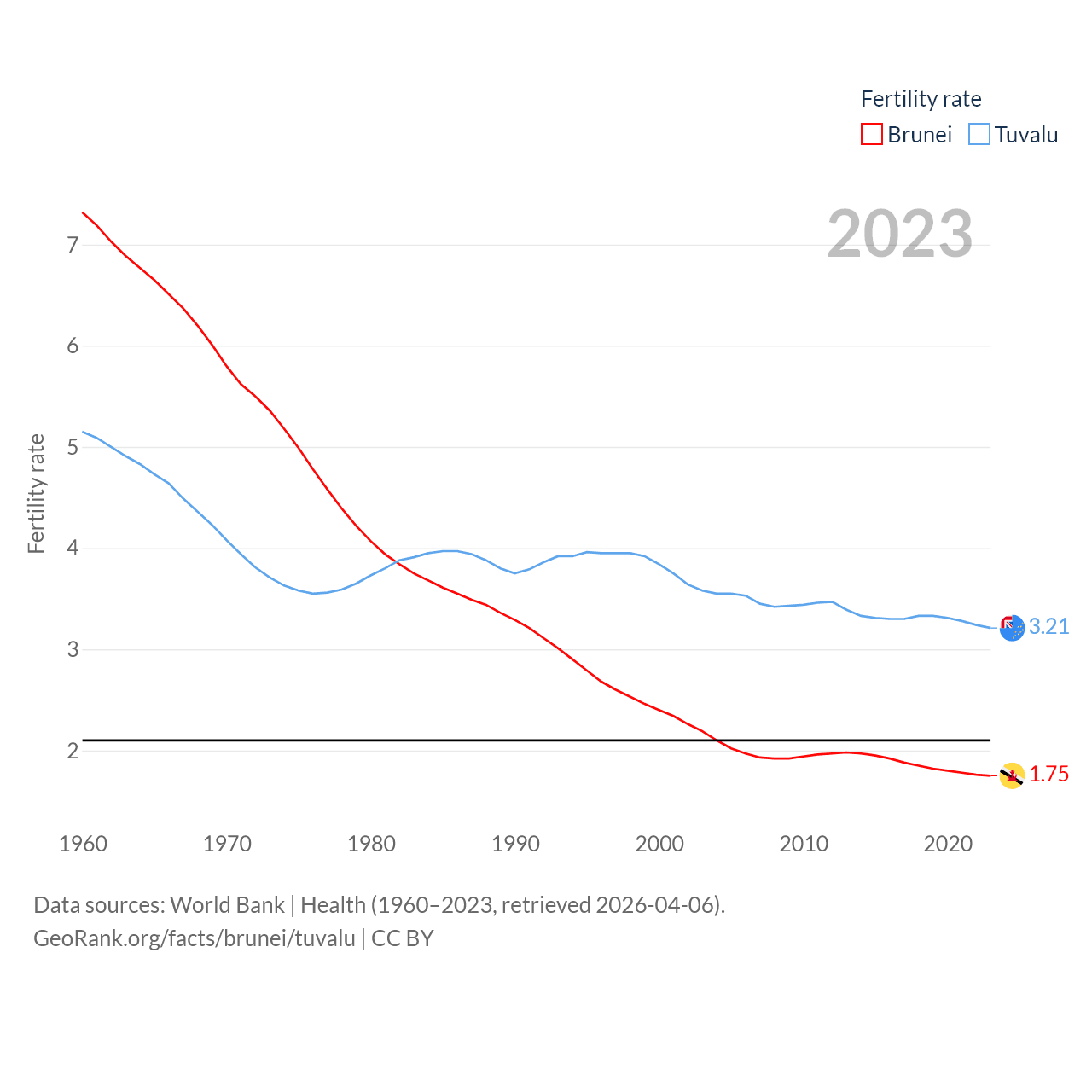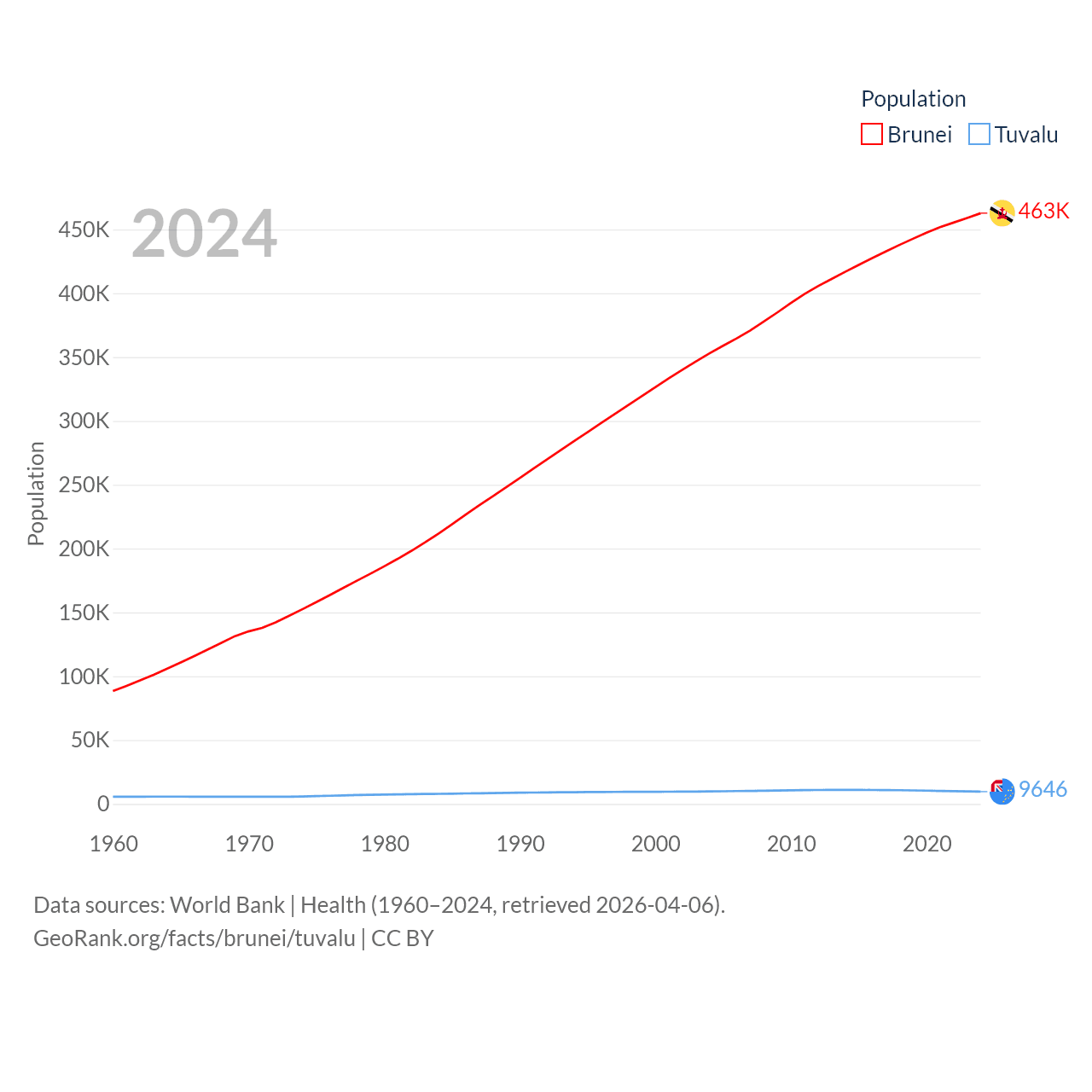 Brunei has a population of 463K (ranked 170/197), compared with 9.65K in Tuvalu (ranked 196/197). Brunei's land area is 2,035 sq mi versus 11.6 sq mi for Tuvalu (ranked 165th vs. 194th).