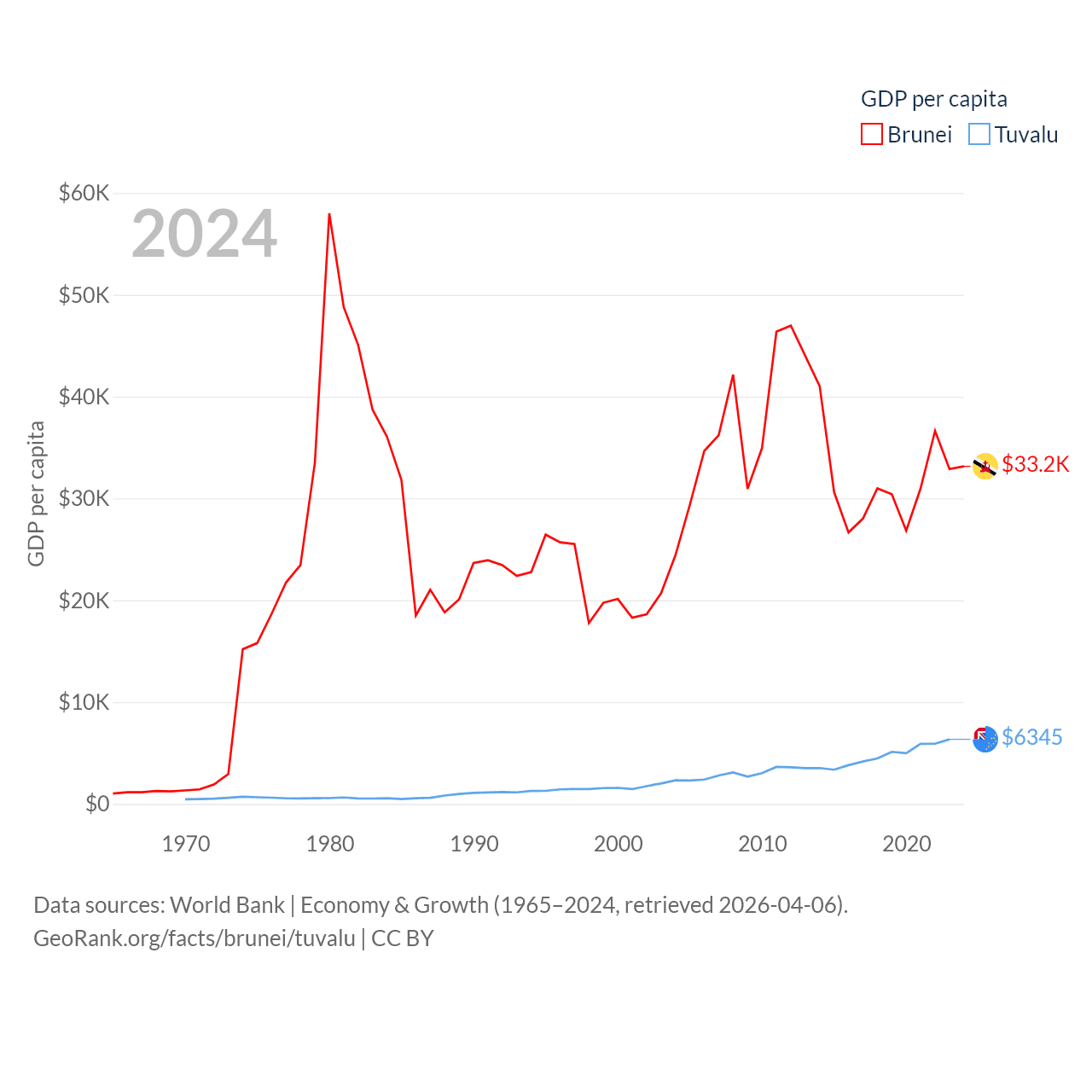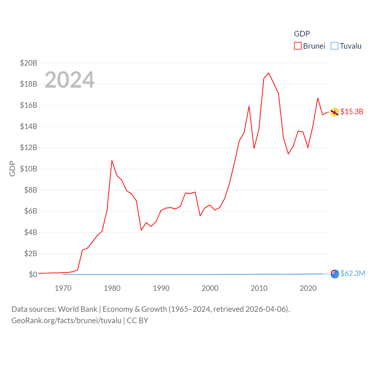 By GDP, Brunei ranks 142/197 ($15.3B) and Tuvalu ranks 196/197 ($62.3M). By GDP per capita, Brunei ranks 36/197 ($33,153), while Tuvalu ranks 110/197 ($6,345).