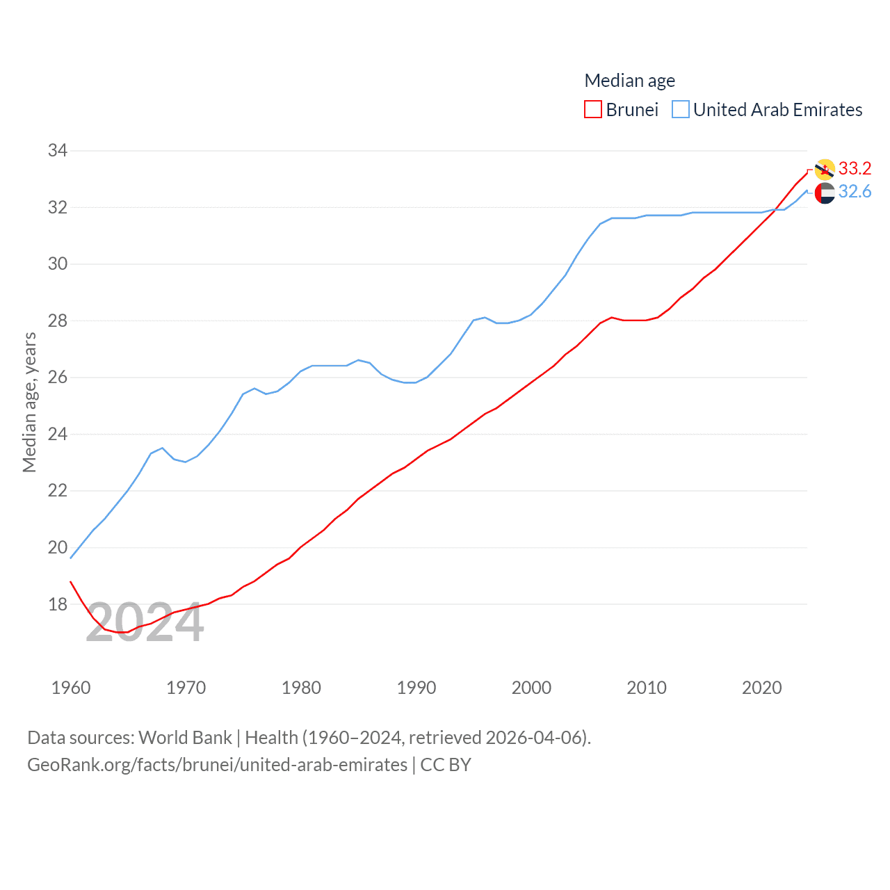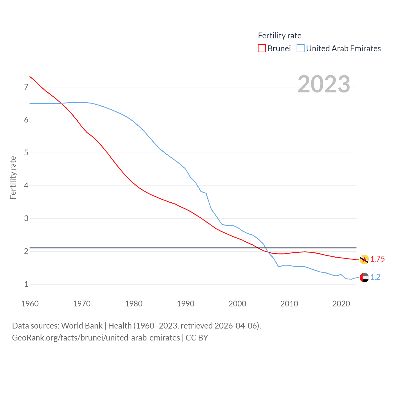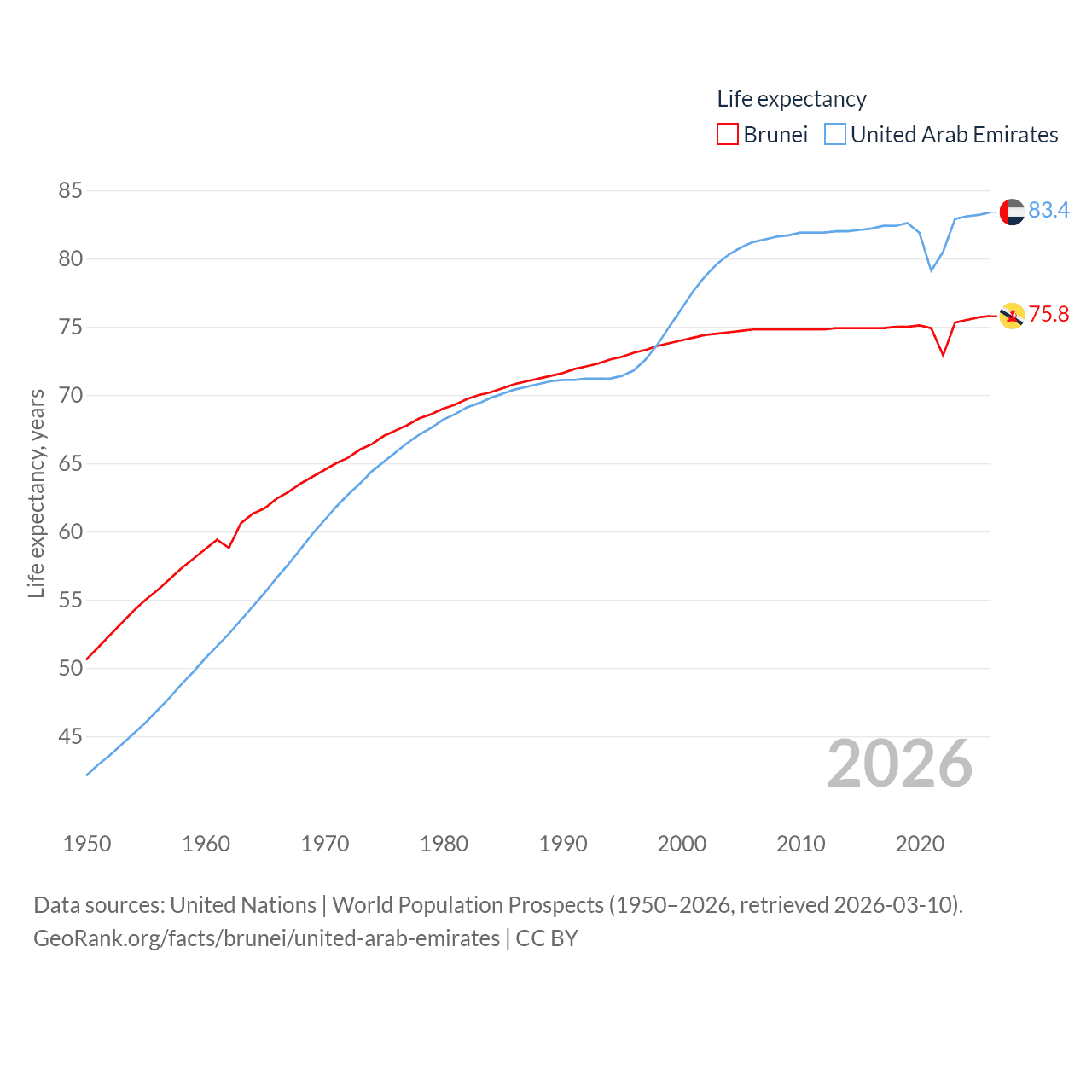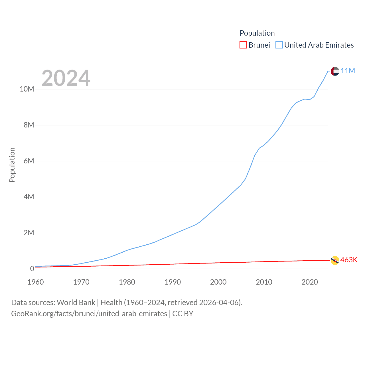 Brunei has a population of 463K (ranked 170/197), compared with 11M in The United Arab Emirates (ranked 86/197). Brunei's land area is 2,035 sq mi versus 27,421 sq mi for The United Arab Emirates (ranked 165th vs. 117th).