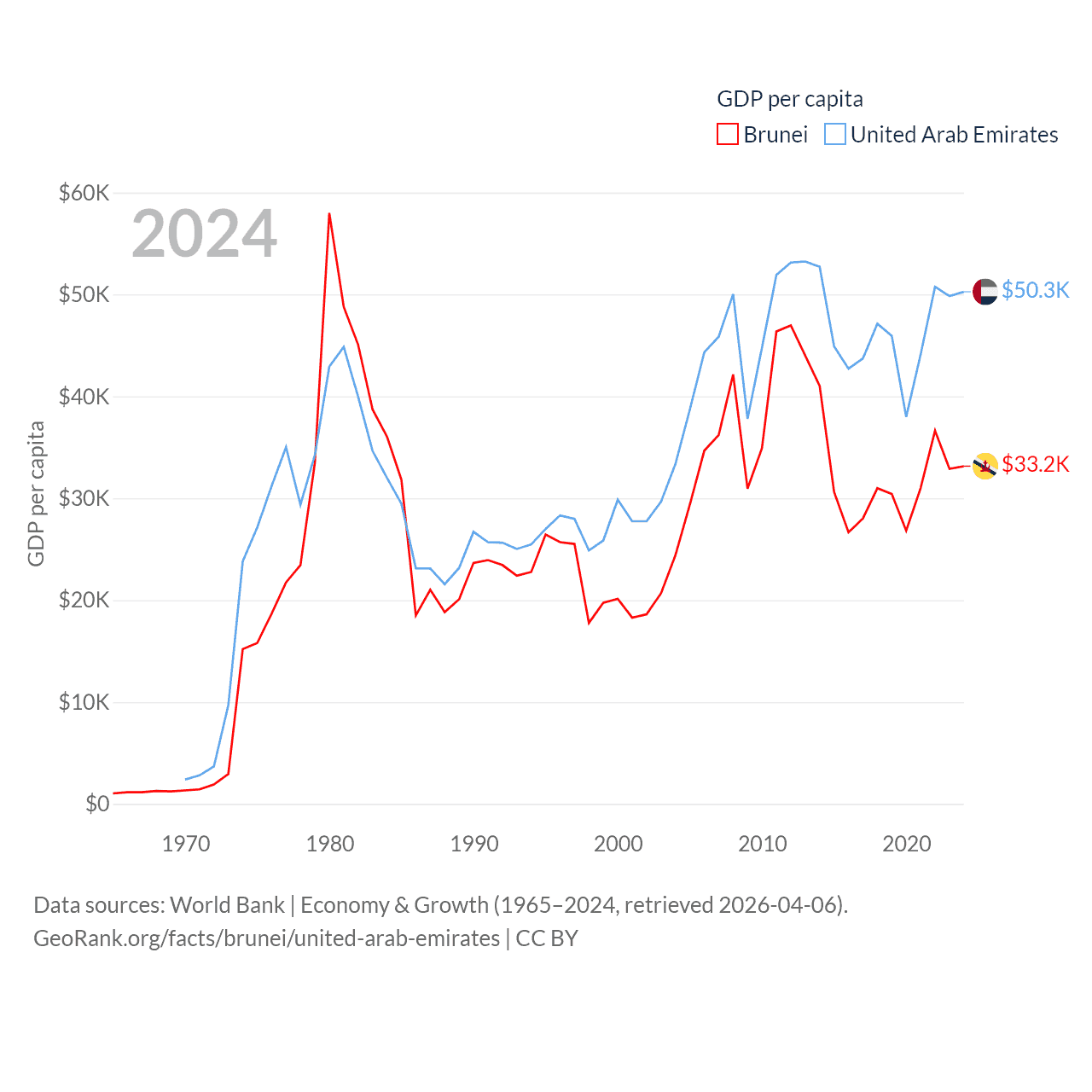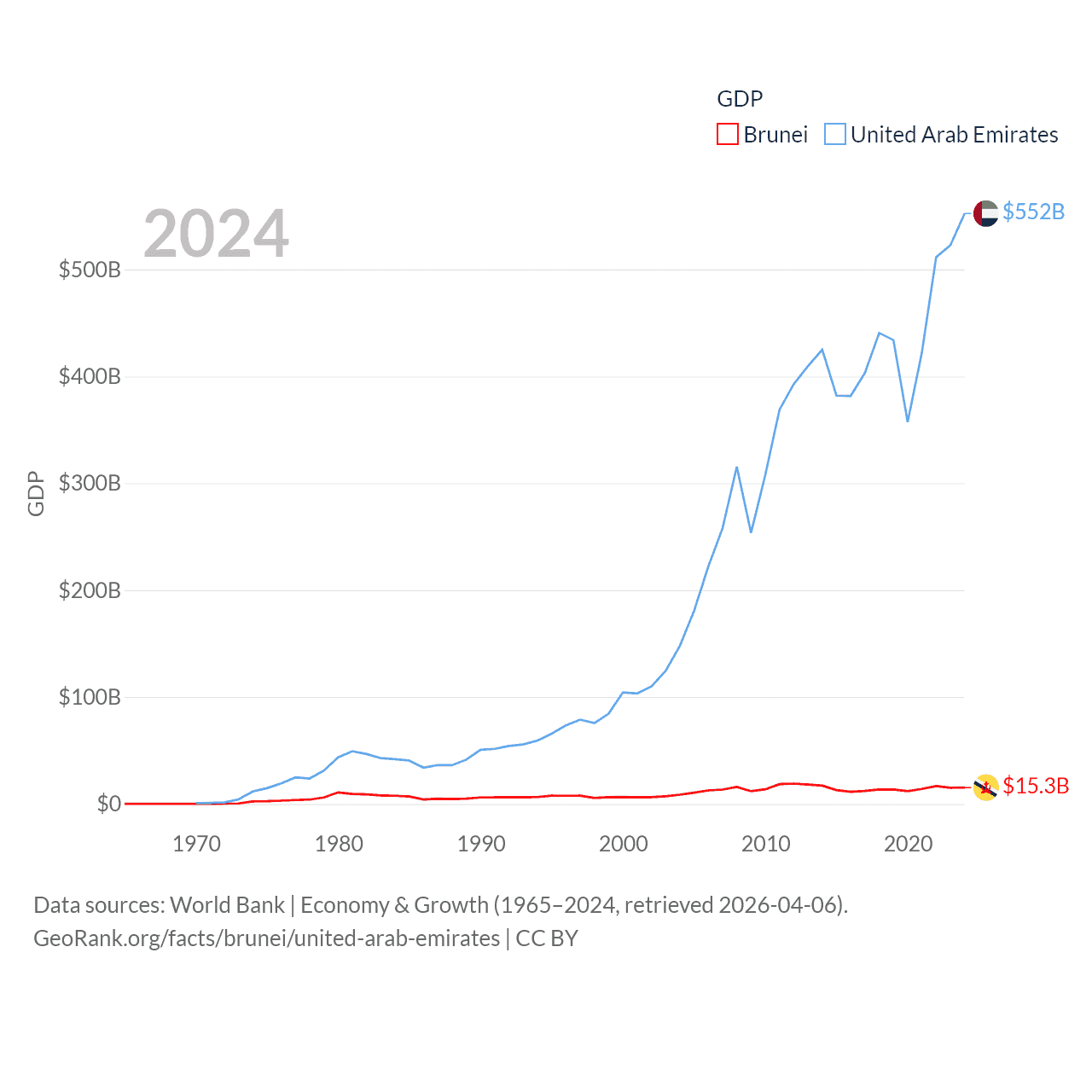 By GDP, Brunei ranks 142/197 ($15.3B) and The United Arab Emirates ranks 27/197 ($552B). By GDP per capita, Brunei ranks 36/197 ($33,153), while The United Arab Emirates ranks 24/197 ($50,274).