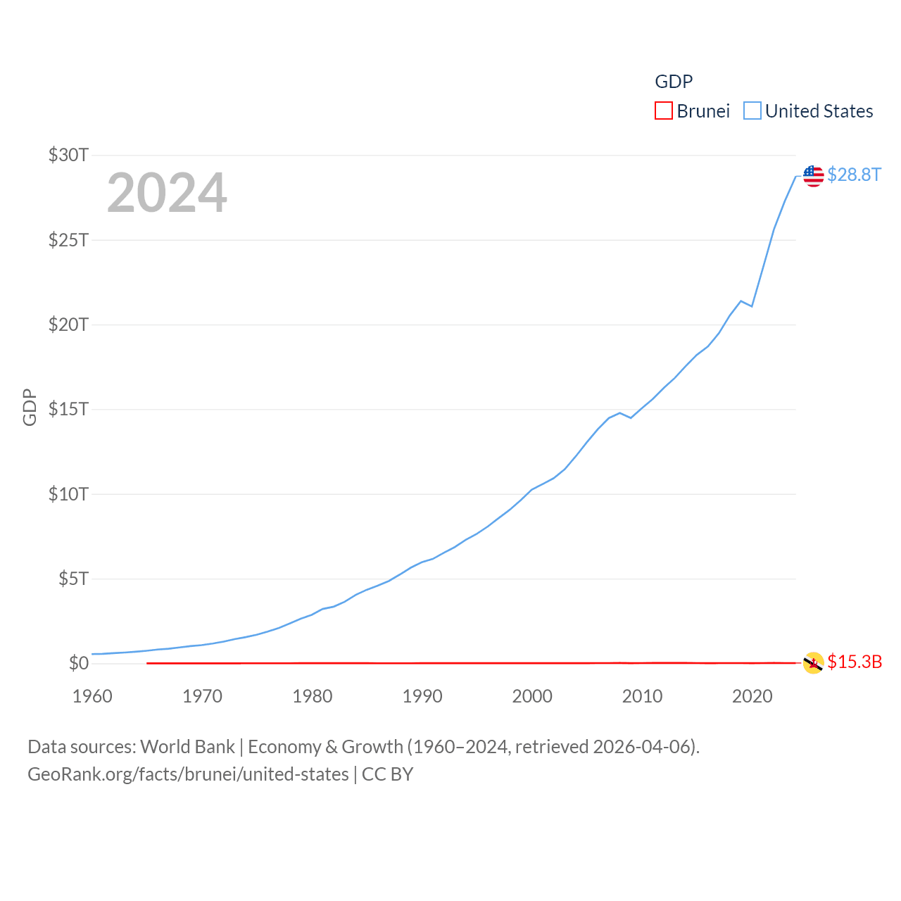 By GDP, Brunei ranks 142/197 ($15.3B) and The United States ranks 1/197 ($28.8T). By GDP per capita, Brunei ranks 36/197 ($33,153), while The United States ranks 10/197 ($84,534).