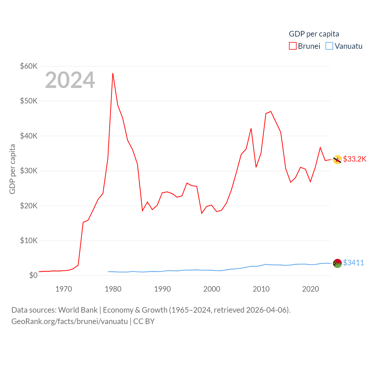By GDP, Brunei ranks 142/197 ($15.3B) and Vanuatu ranks 188/197 ($1.12B). By GDP per capita, Brunei ranks 36/197 ($33,153), while Vanuatu ranks 137/197 ($3,411).