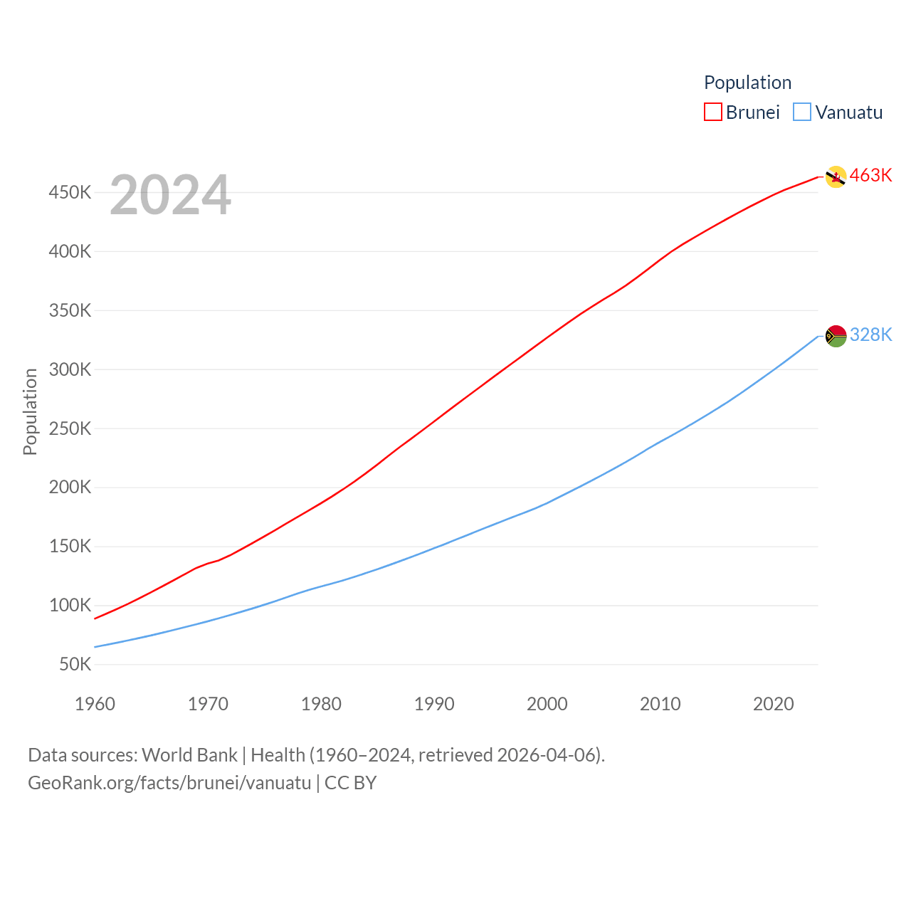 Brunei has a population of 463K (ranked 170/197), compared with 328K in Vanuatu (ranked 174/197). Brunei's land area is 2,035 sq mi versus 4,707 sq mi for Vanuatu (ranked 165th vs. 157th).