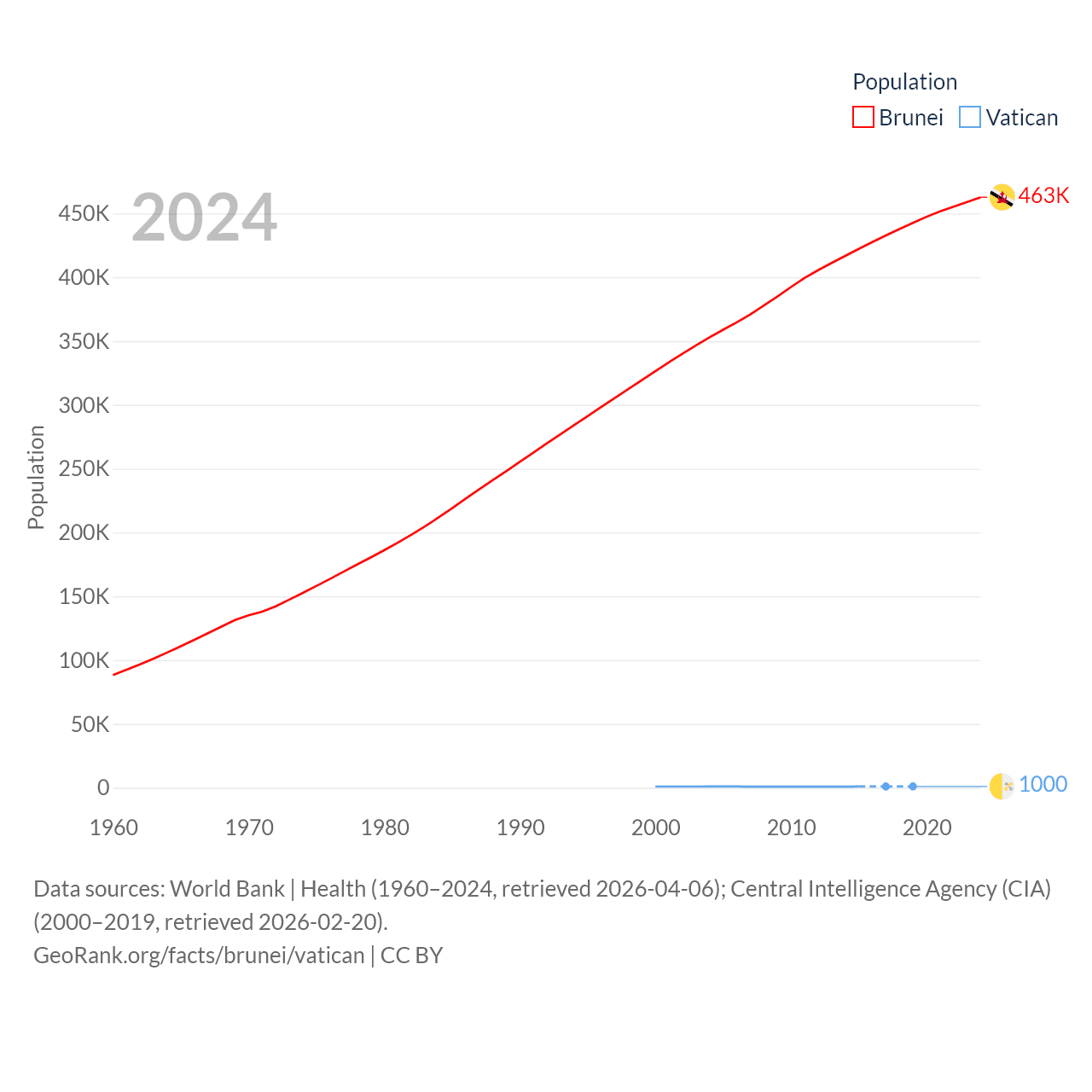 Brunei has a population of 463K (ranked 170/197), compared with 1K in The Vatican (ranked 197/197). Brunei's land area is 2,035 sq mi versus 0.17 sq mi for The Vatican (ranked 165th vs. 197th).