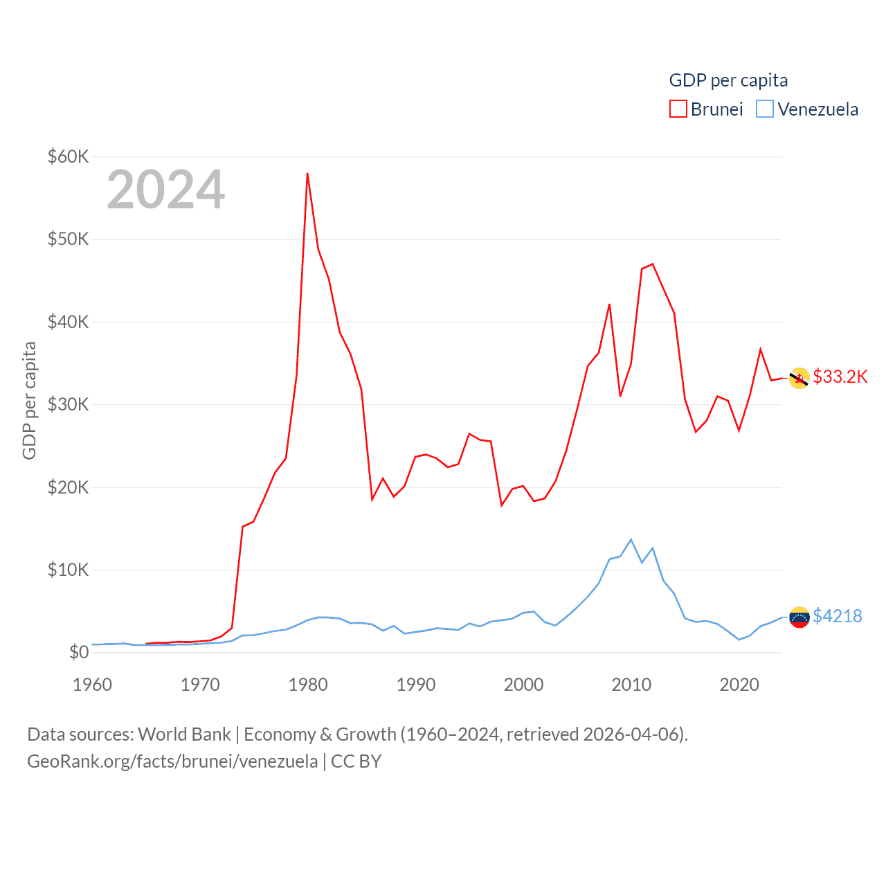 By GDP, Brunei ranks 142/197 ($15.3B) and Venezuela ranks 65/197 ($120B). By GDP per capita, Brunei ranks 36/197 ($33,153), while Venezuela ranks 128/197 ($4,218).