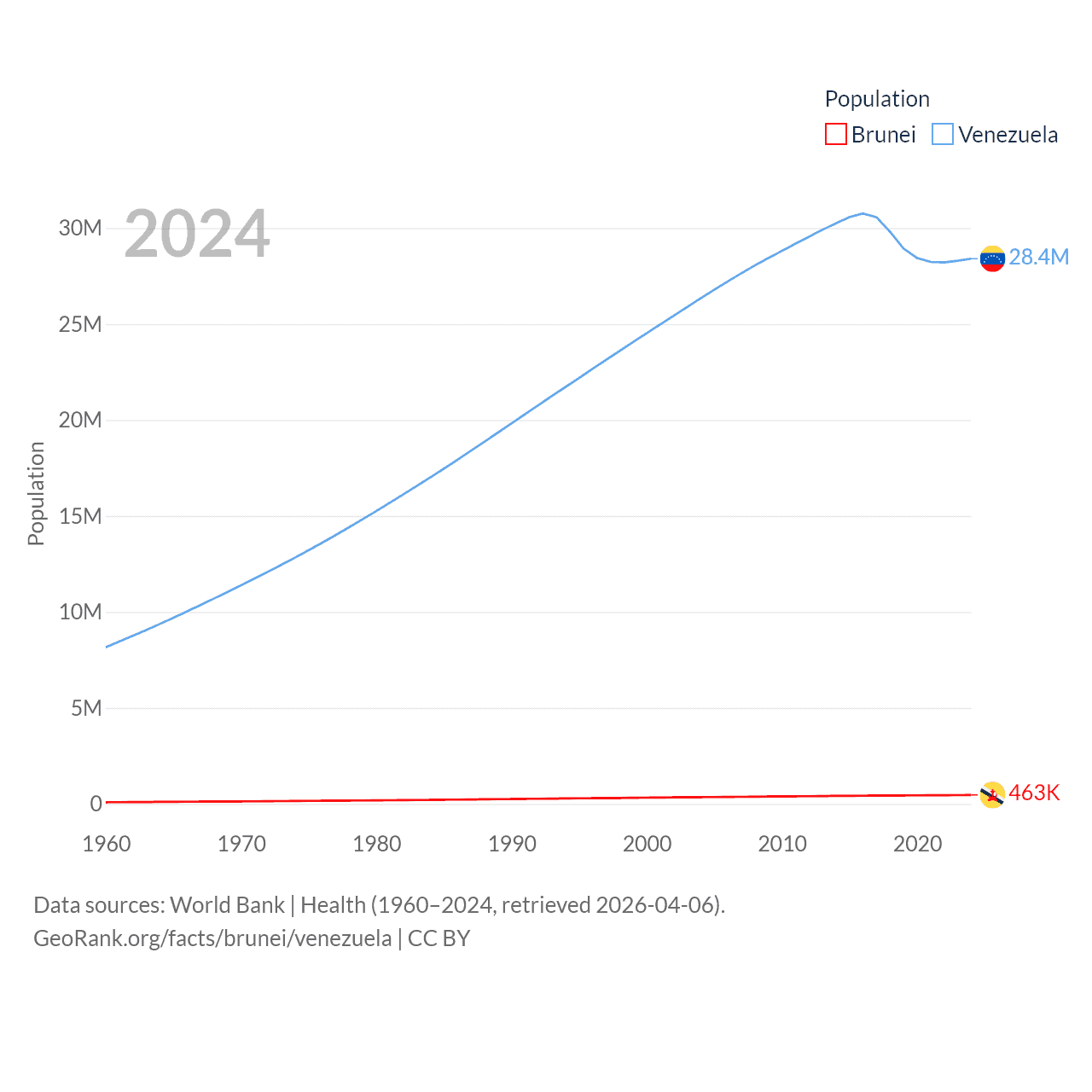 Brunei has a population of 463K (ranked 170/197), compared with 28.4M in Venezuela (ranked 53/197). Brunei's land area is 2,035 sq mi versus 340,561 sq mi for Venezuela (ranked 165th vs. 32nd).