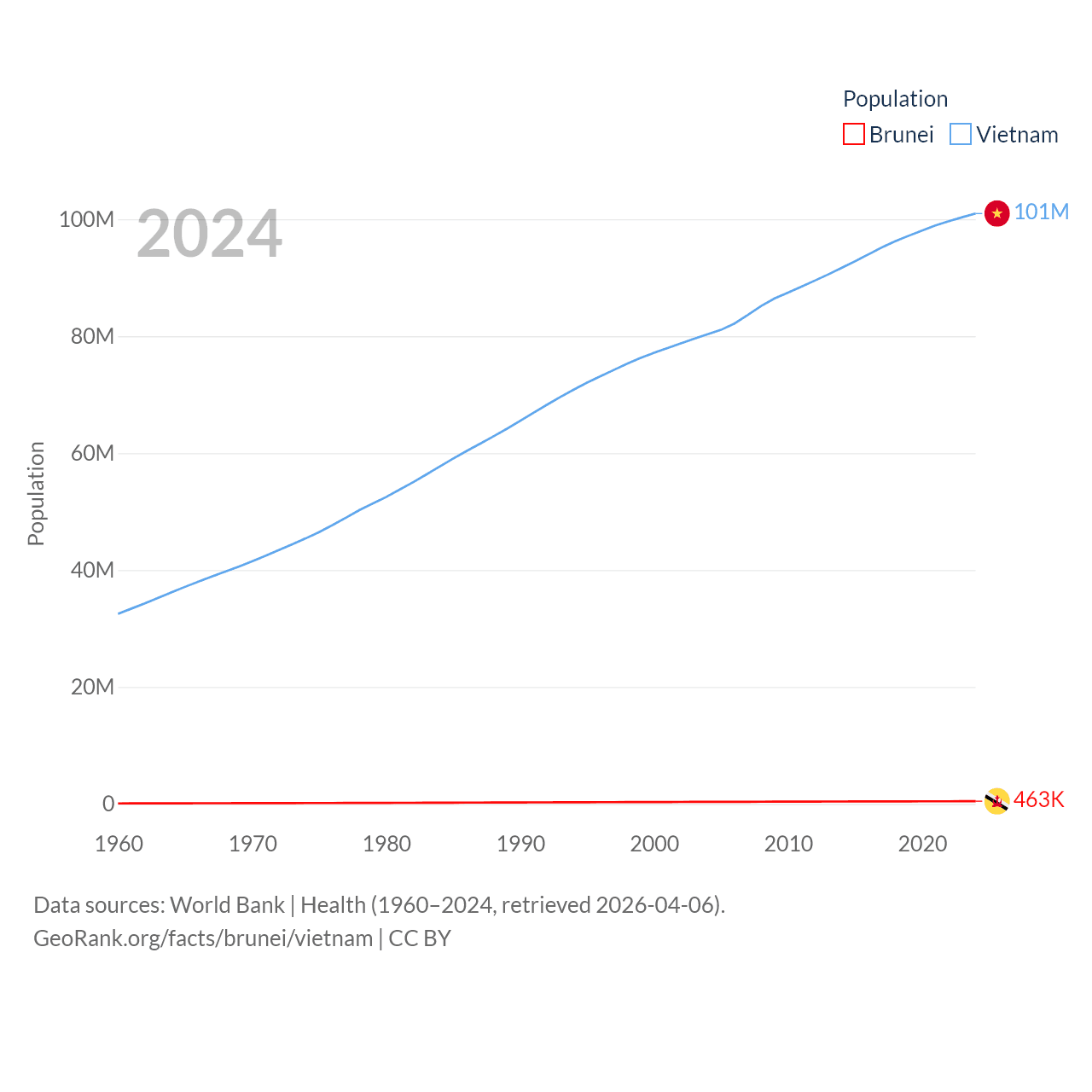 Brunei has a population of 463K (ranked 170/197), compared with 101M in Vietnam (ranked 16/197). Brunei's land area is 2,035 sq mi versus 121,016 sq mi for Vietnam (ranked 165th vs. 67th).