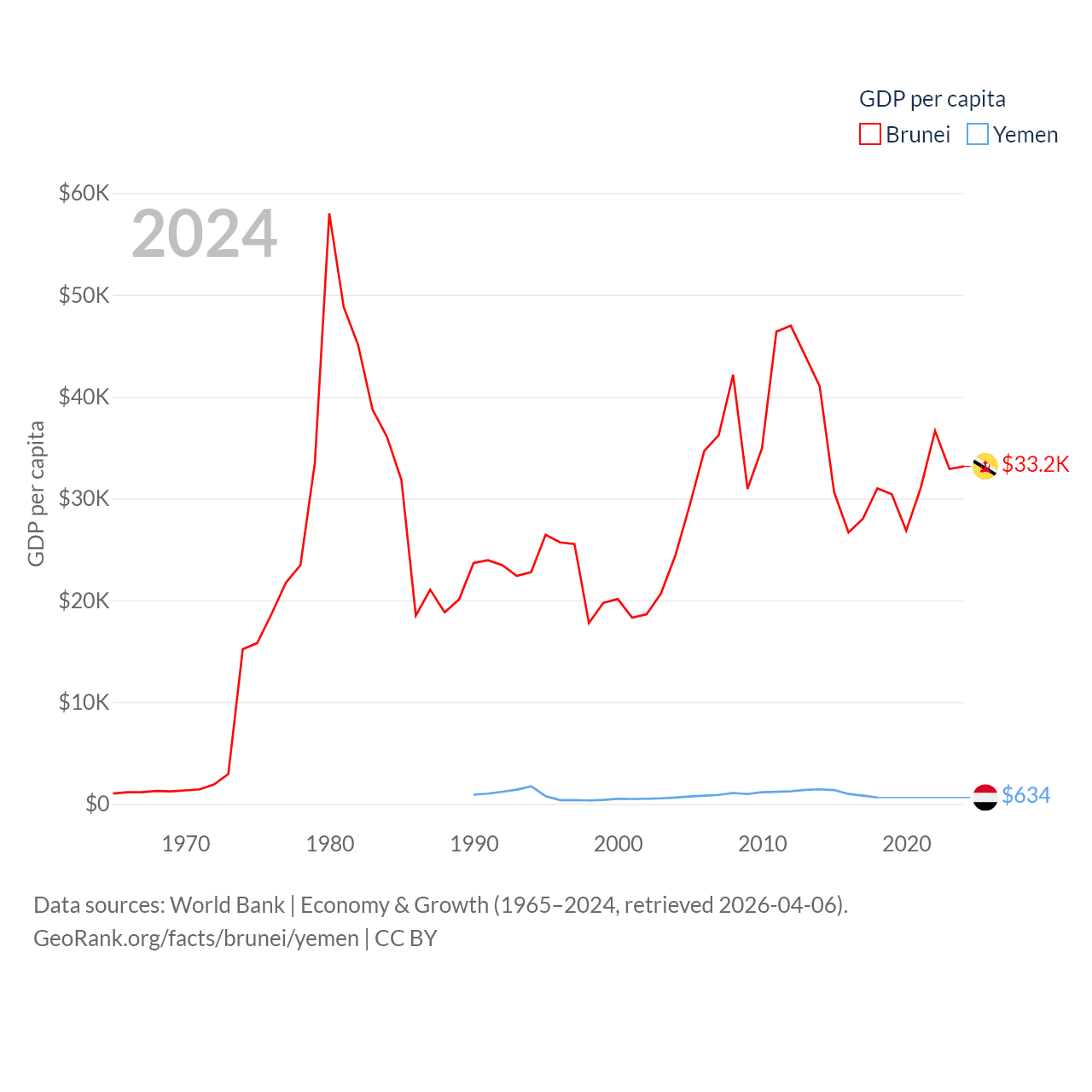 By GDP, Brunei ranks 142/197 ($15.3B) and Yemen ranks 125/197 ($21.6B). By GDP per capita, Brunei ranks 36/197 ($33,153), while Yemen ranks 191/197 ($634).