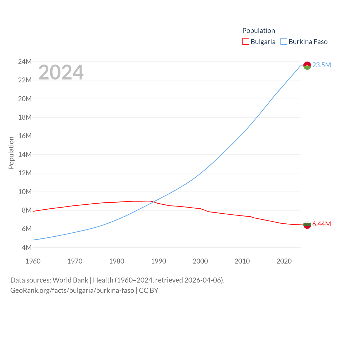 Bulgaria has a population of 6.44M (ranked 110/197), compared with 23.5M in Burkina Faso (ranked 59/197). Bulgaria's land area is 41,915 sq mi versus 105,638 sq mi for Burkina Faso (ranked 101st vs. 73rd).