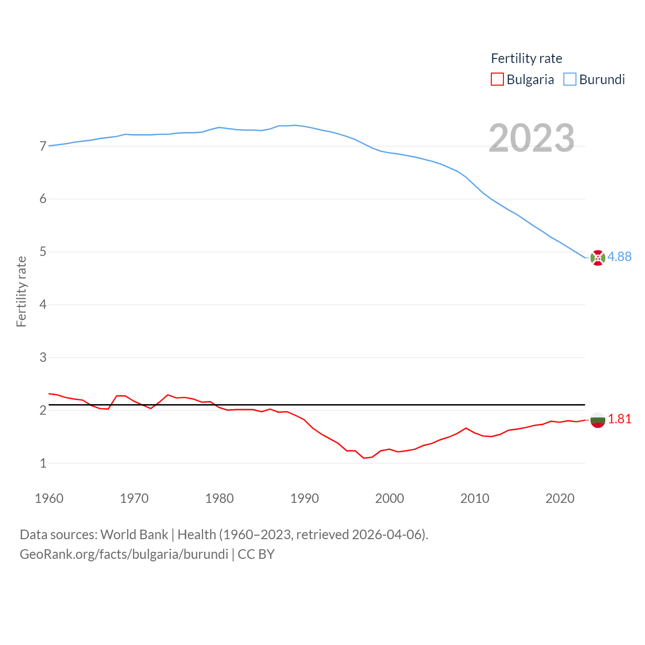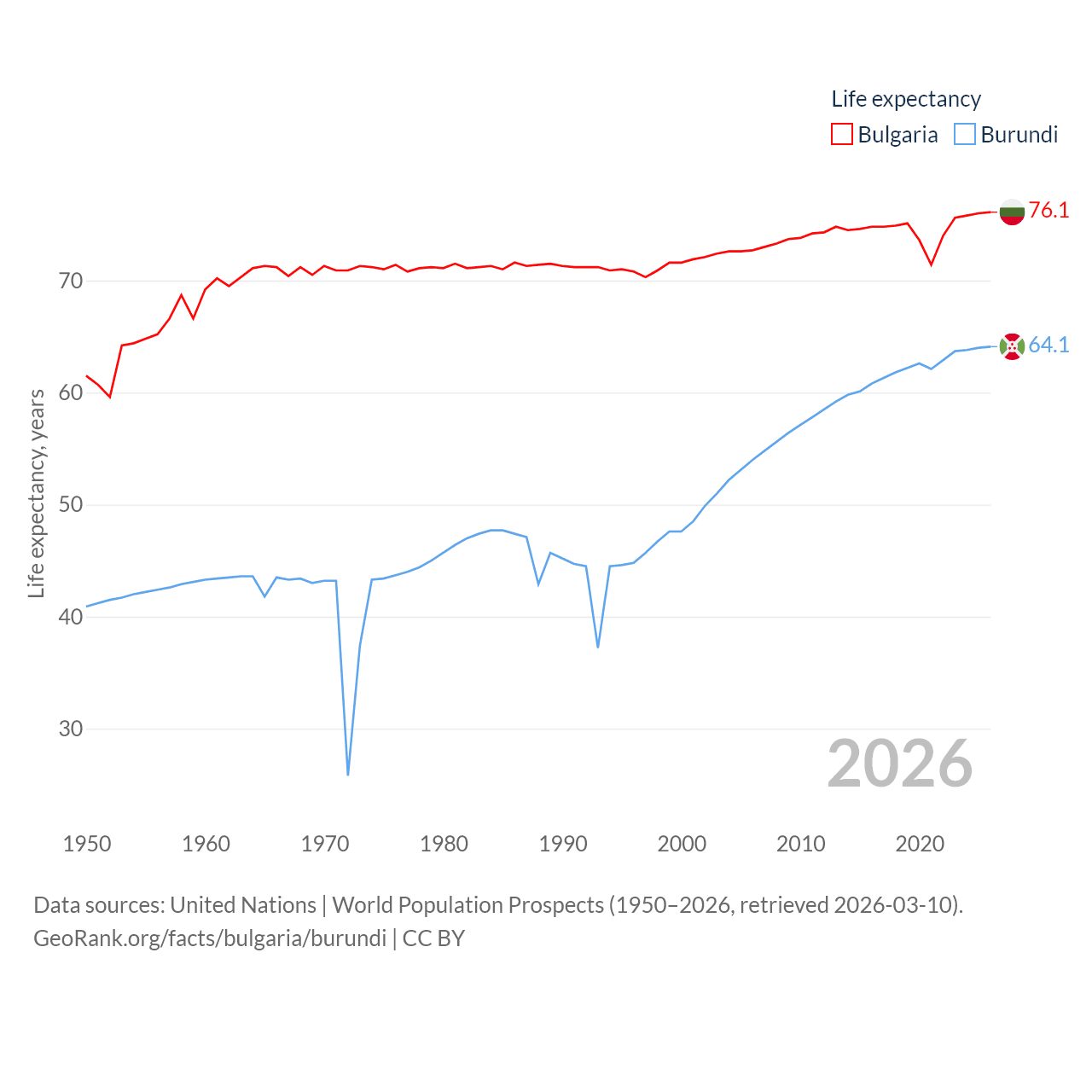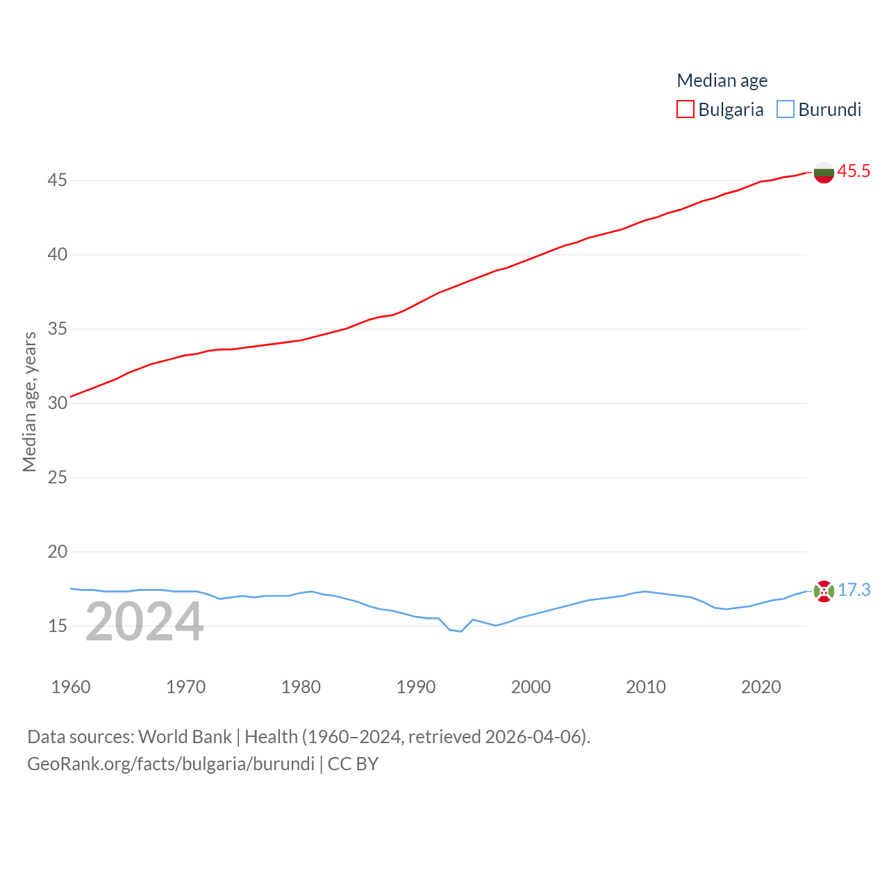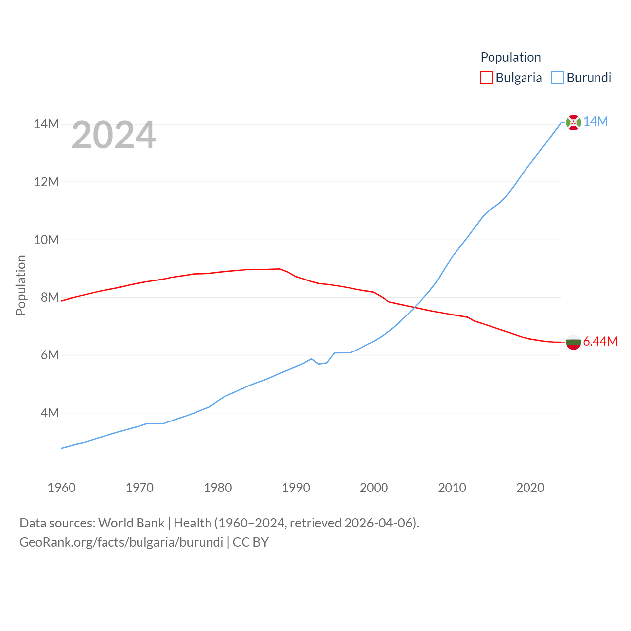 Bulgaria has a population of 6.44M (ranked 110/197), compared with 14M in Burundi (ranked 78/197). Bulgaria's land area is 41,915 sq mi versus 9,915 sq mi for Burundi (ranked 101st vs. 144th).