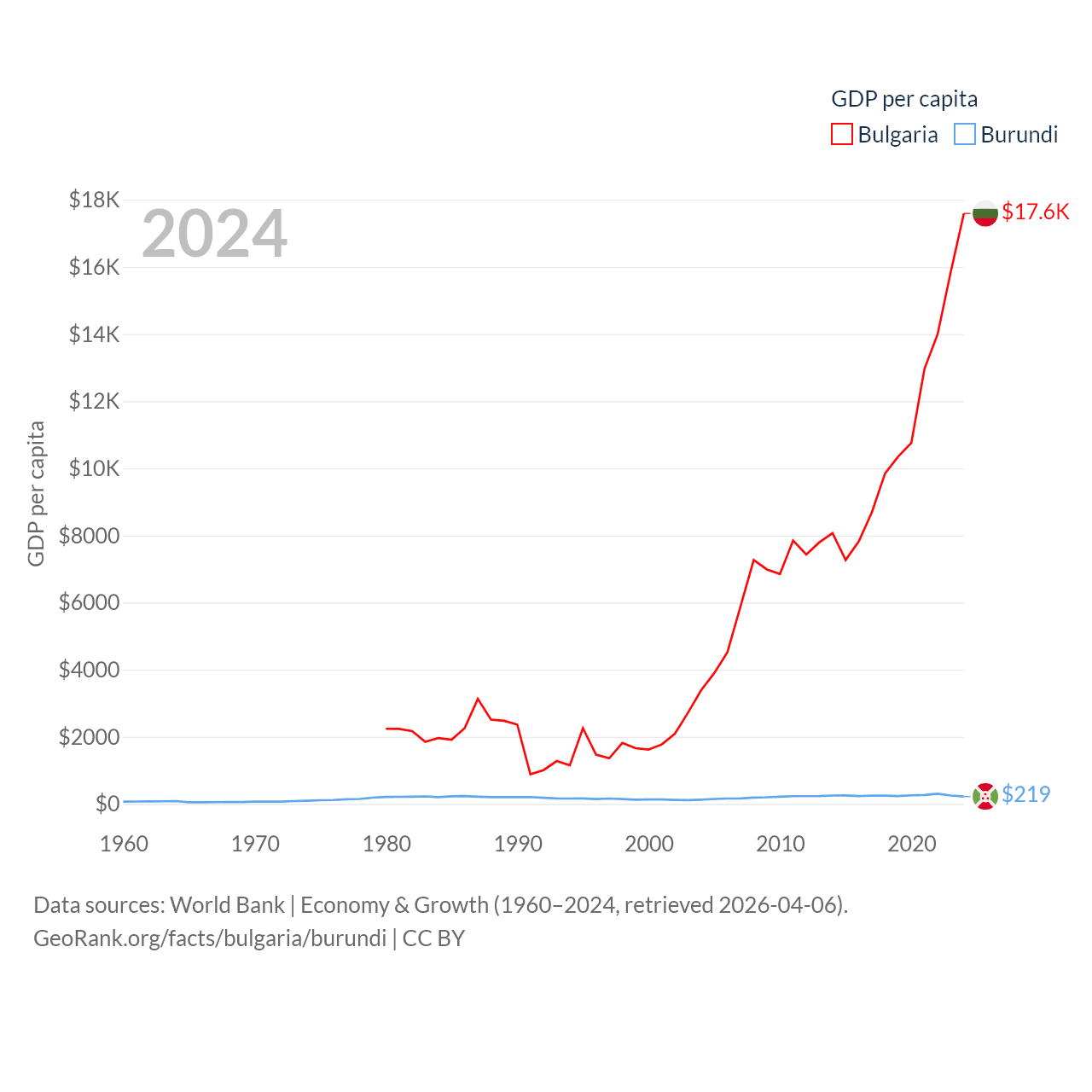 By GDP, Bulgaria ranks 67/197 ($113B) and Burundi ranks 169/197 ($3.08B). By GDP per capita, Bulgaria ranks 64/197 ($17,596), while Burundi ranks 197/197 ($219.4).