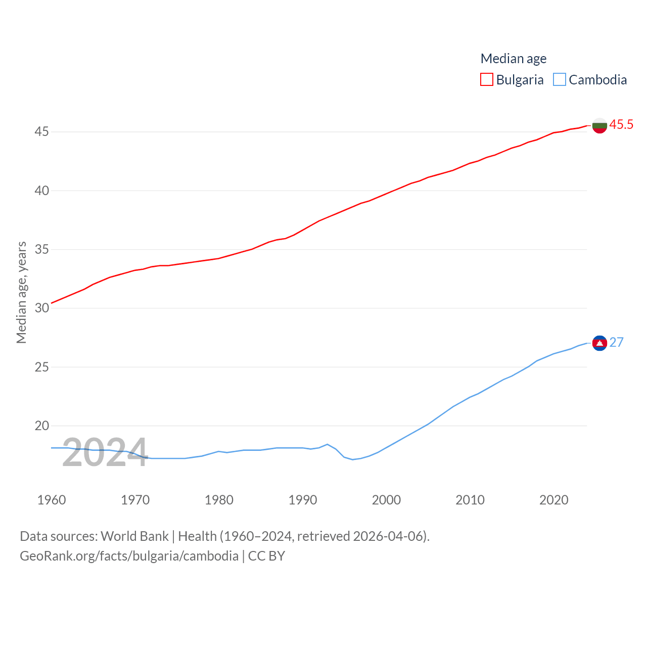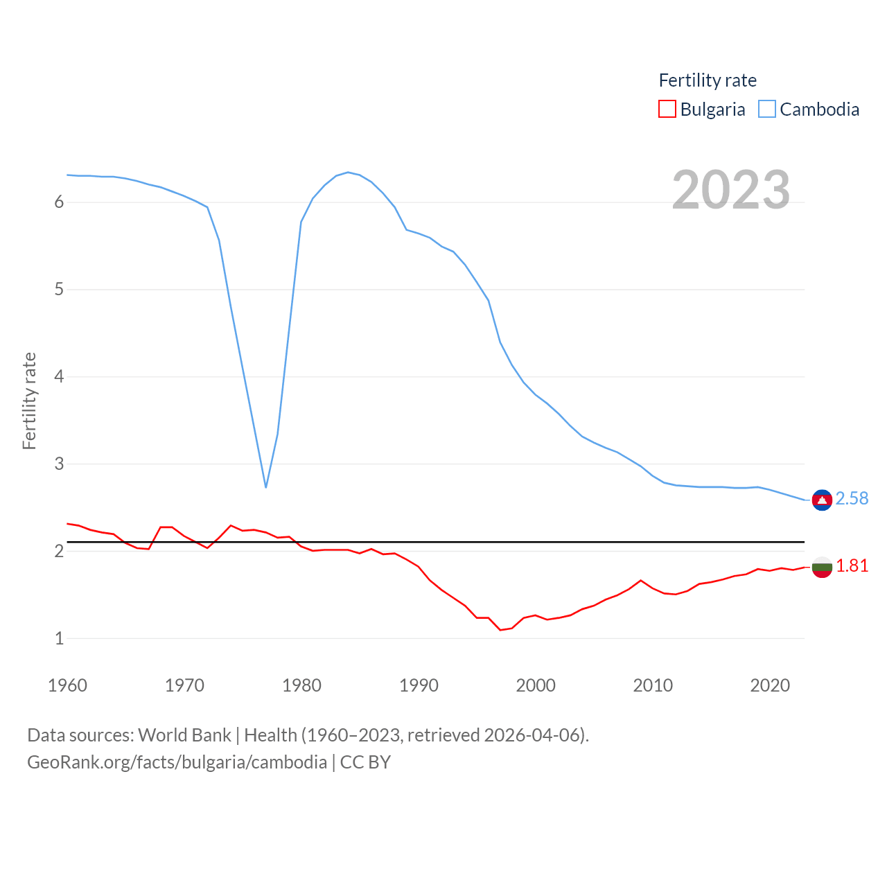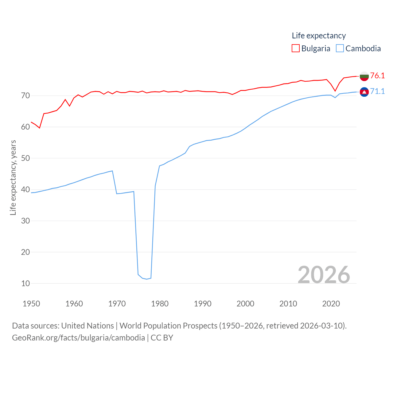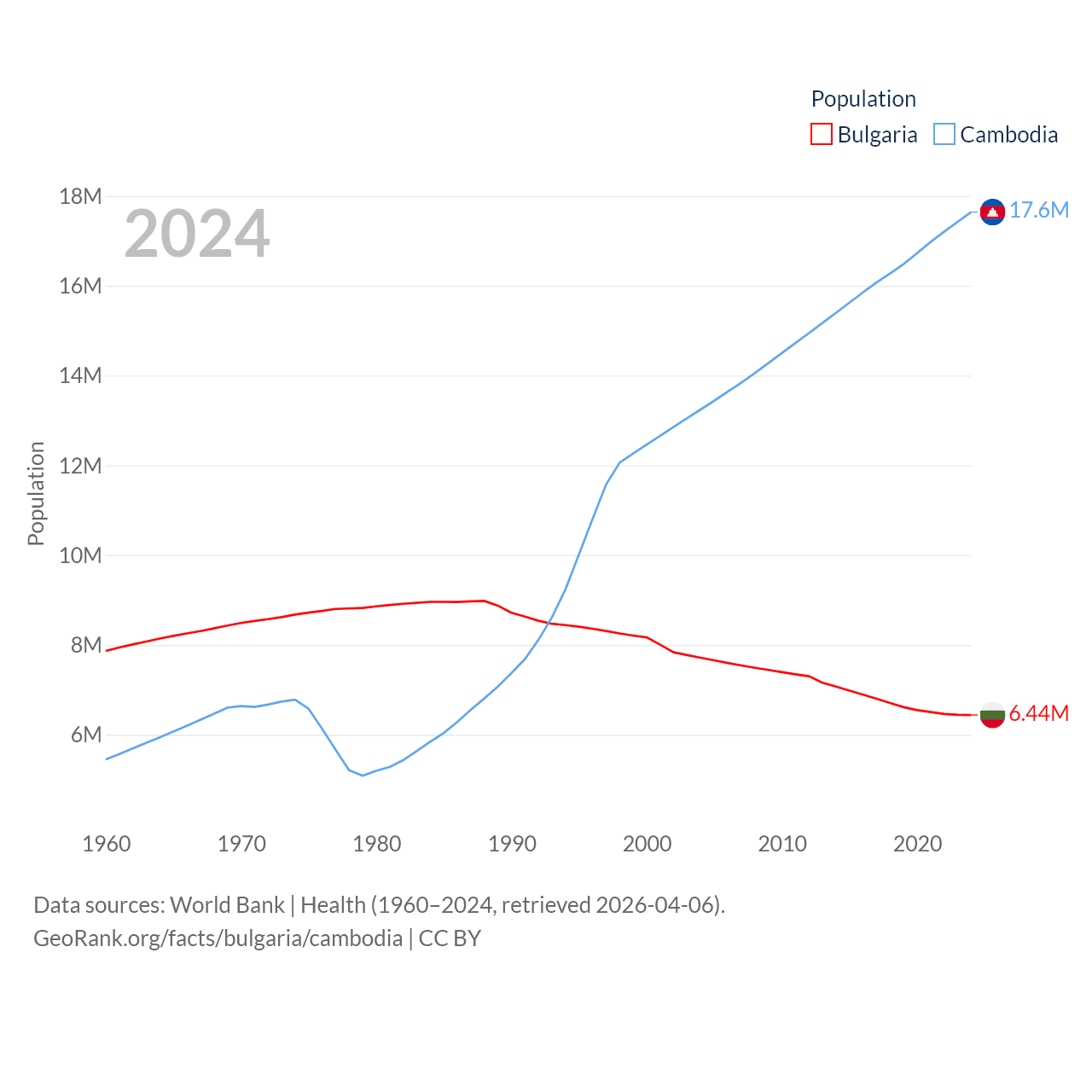Bulgaria has a population of 6.44M (ranked 110/197), compared with 17.6M in Cambodia (ranked 73/197). Bulgaria's land area is 41,915 sq mi versus 68,155 sq mi for Cambodia (ranked 101st vs. 88th).