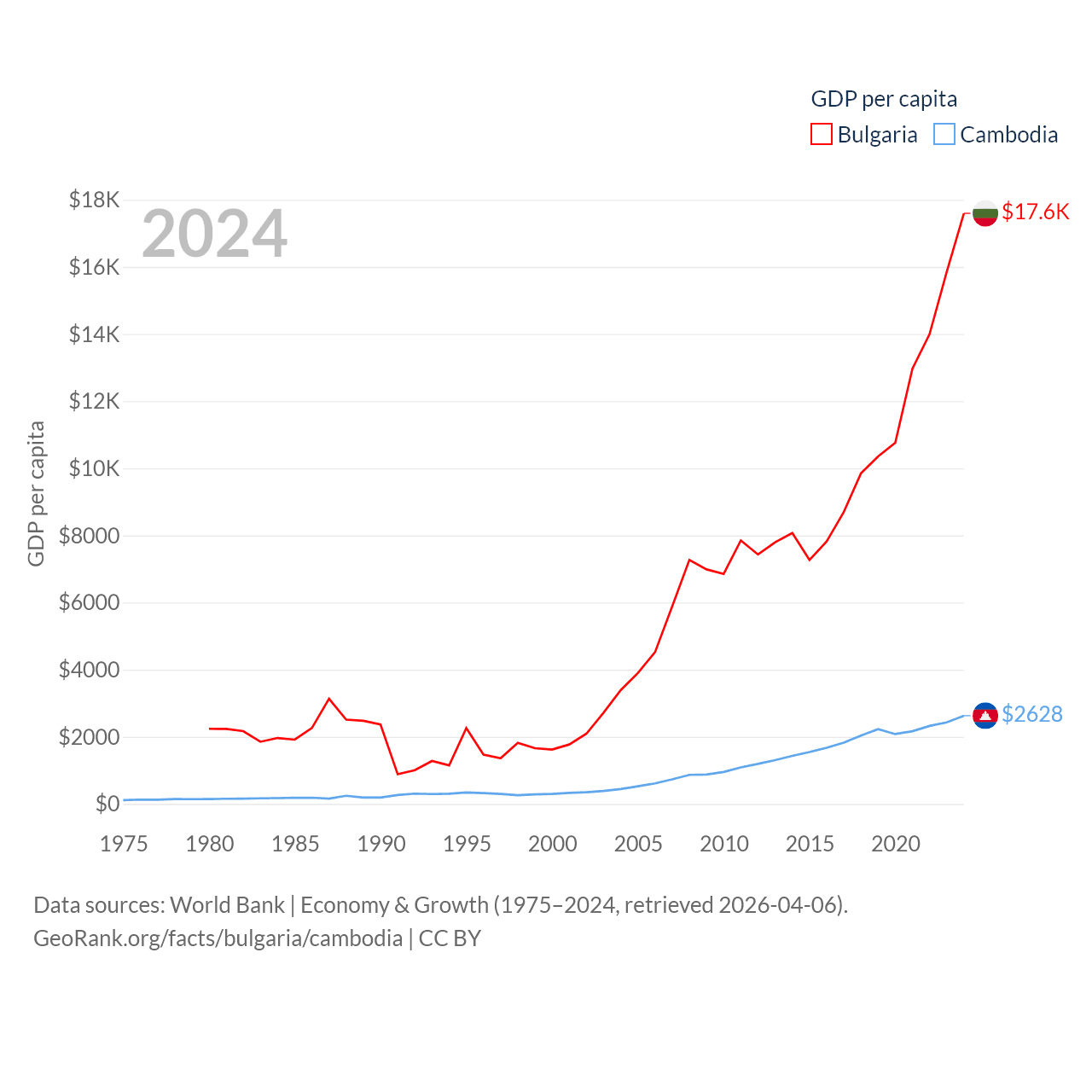 By GDP, Bulgaria ranks 67/197 ($113B) and Cambodia ranks 97/197 ($46.4B). By GDP per capita, Bulgaria ranks 64/197 ($17,596), while Cambodia ranks 145/197 ($2,628).