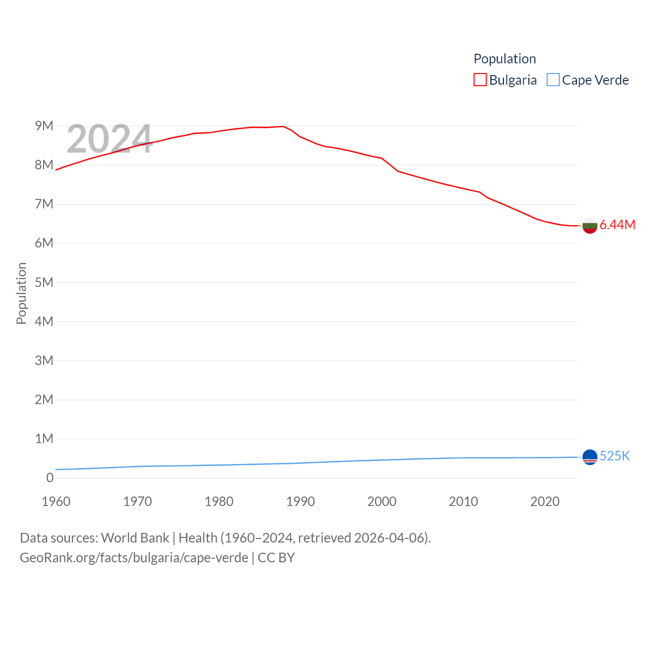 Bulgaria has a population of 6.44M (ranked 110/197), compared with 525K in Cape Verde (ranked 169/197). Bulgaria's land area is 41,915 sq mi versus 1,556 sq mi for Cape Verde (ranked 101st vs. 167th).